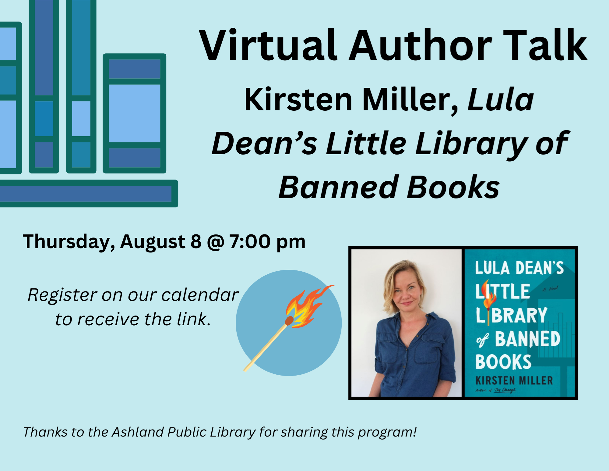 VIRTUAL: Author Talk with Kirsten Miller Thursday, August 8, 7:00 pm Join us for this discussion with author Kirsten Miller. Her book "Lula Dean's Little Library of Banned Books" is a provocative and hilarious summer read that will have book lovers cheering and everyone talking! Kirsten Miller, author of 'The Change', brings us a bracing, wildly entertaining satire about a small Southern town, a pitched battle over banned books, and a little lending library that changes everything. In a day when this topic can rip people apart, learn how one small community was able to come together - it's fictional but, maybe, hopeful, too! Thanks to the Friends of the Ashland Public Library for sharing this program!