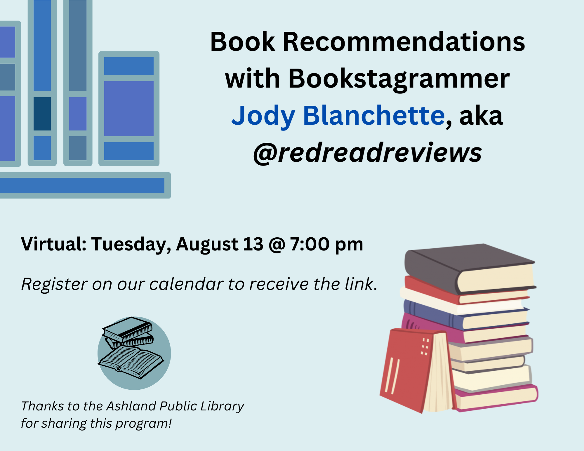 Tuesday, August 13 at 7:00 pm Not sure what to read next? Join Jody (aka @RedReadReviews) for 30 minutes of pure book recommendations - every genre and interest! Jody is an Instagram reviewer and Book Club leader. We can't wait to hear what she'll be recommending - be ready for your TBR pile to fall over! We'll send out a list of all recommendations for those who register. Thanks to the Ashland Public Library for sharing this program!