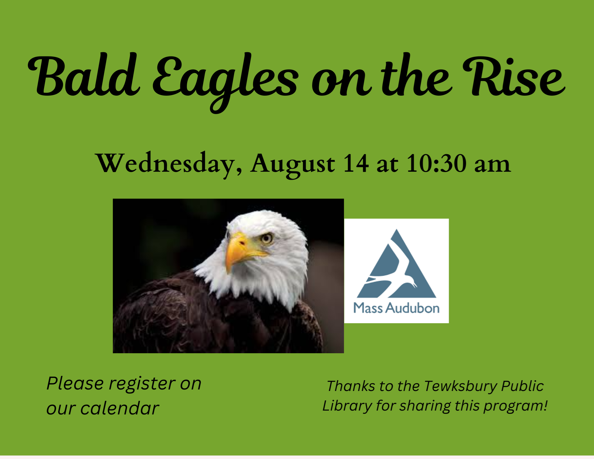 VIRTUAL: Bald Eagles on the Rise Wednesday, August 14 at 10:30 am The Bald Eagle, formerly endangered, now has a thriving population over much of the country including the northeast. Learn the natural history and life cycle of bald eagle as well as the historic restoration project in Massachusetts resulting in a healthy population and removal of endangered species status. Eagles are seen in the northeast throughout the year, and during fall migration you might be fortunate to see a non-nesting golden eagle. Led by Patti Steinman, the Education Coordinator for Mass Audubon’s Connecticut River Valley Sanctuaries, based out of Arcadia in Easthampton and Northampton. She has worked at Mass Audubon for 30 years, developing and overseeing programs for adults, families, and children.