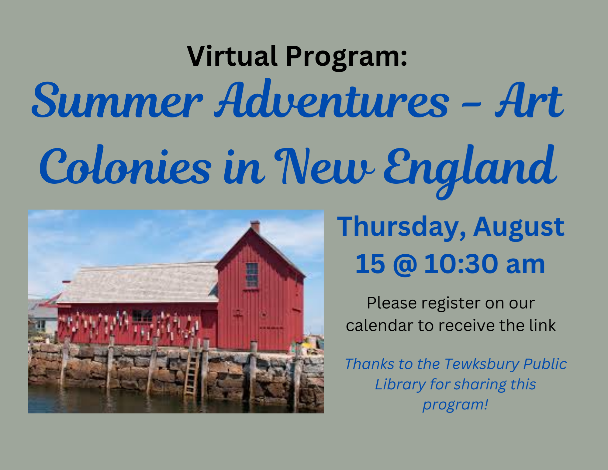 VIRTUAL: Summer Adventures - Art Colonies in New England Thursday, August 15 at 10:30 am Explore eight late-19th and early-20th century summer art colonies across New England: Provincetown and Cape Ann in MA; North Conway and Cornish in NH; Old Lyme and Cos Cob in CT; and Ogunquit and Monhegan Island in ME. Discover the incredible, creative energy that still exists in these art colonies in New England. Led by Martha Chiarchiaro, owner of Seeing History, who has brought history to life through the art of the times for more than 30 years. She received her Masters’ degree in the History of Art from Williams College and provides a variety of art history presentations at the Worcester Art Museum, the Worcester Institute for Senior Education (WISE), libraries, senior centers, and garden clubs. Thanks to the Friends of the Tewksbury Public Library and Corning Community Impact & Investment for sharing this program!