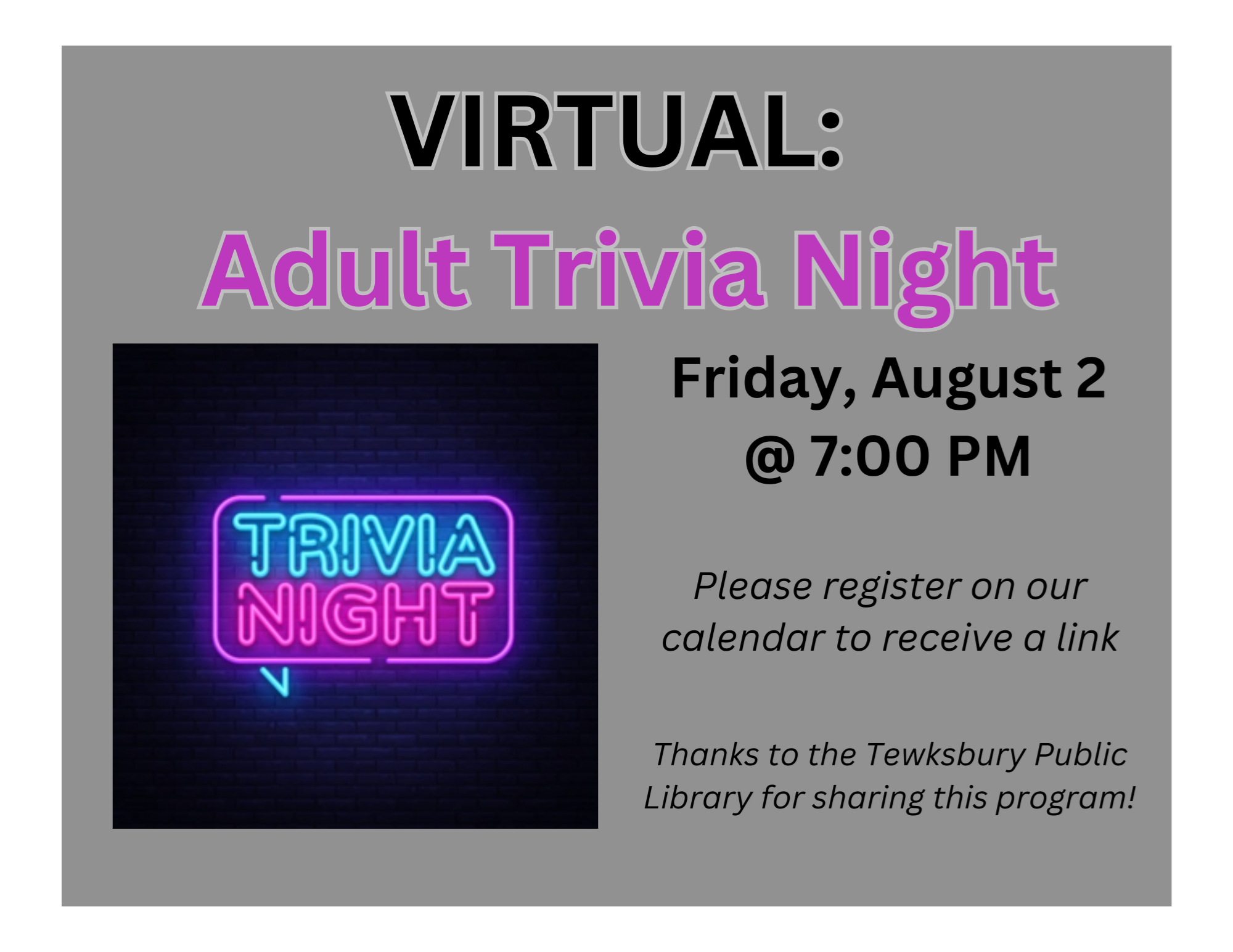 VIRTUAL: Adult Trivia Night Friday, August 2, 7:00 pm Test your knowledge by answering 60 trivia questions (four rounds of 15) created by librarian and trivia host extraordinaire Kat Lewin. Recruit some teammates or play solo -- the choice is yours! Be prepared to answer a hodgepodge of general knowledge trivia questions. That's right, for just the second time in four years, we're going theme-less, so buckle up! Have you ever learned something and said, "well, that'll come in handy for trivia night someday?" -- It's time. Thanks to the Tewksbury Public Library for sharing this program!