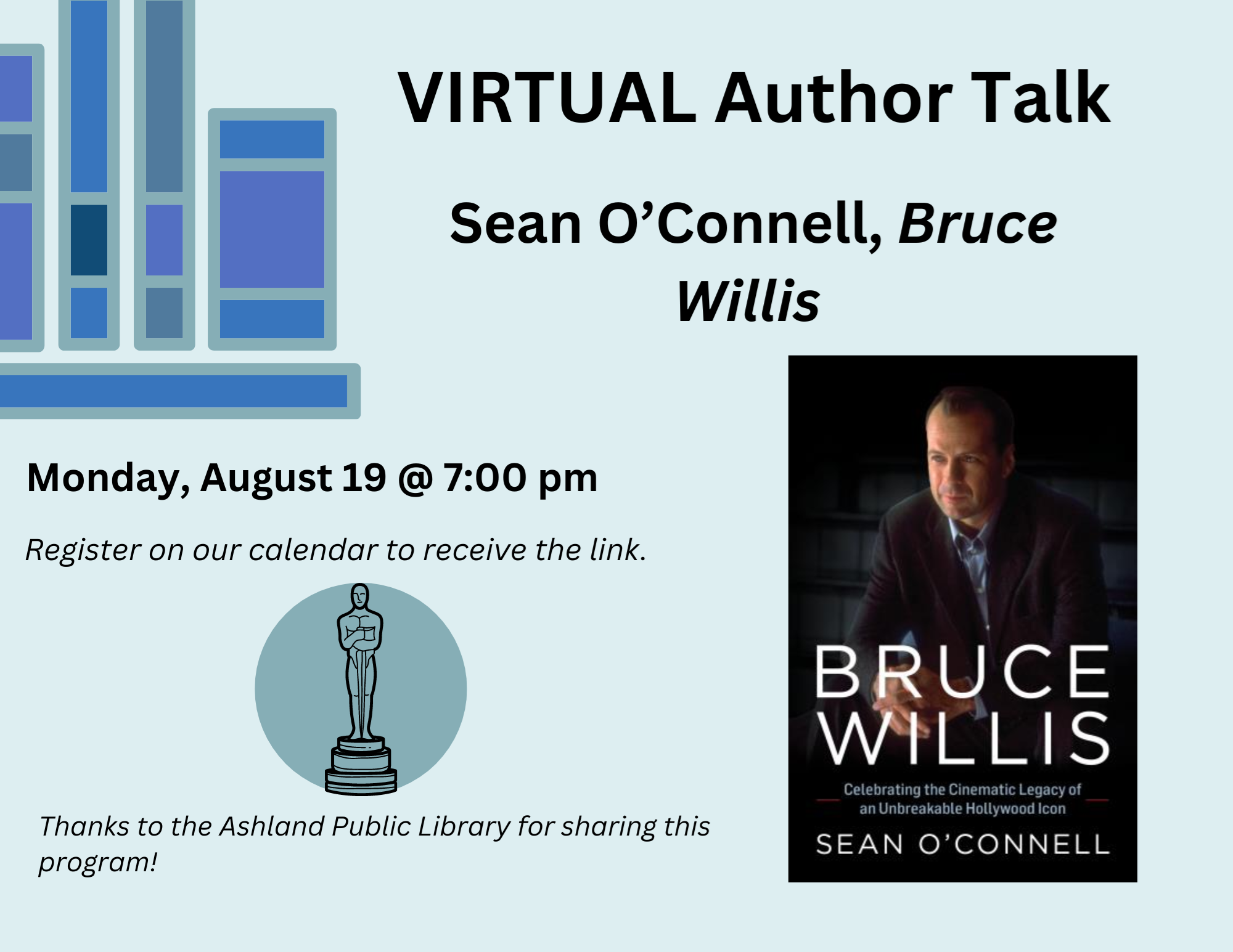 VIRTUAL: Author Talk with Sean O'Connell, Bruce Willis Monday, August 19 at 7:00 pm On a nondescript Wednesday morning in the waning days of March 2023, one of the biggest movie stars on the planet called it quits. No press conference had been organized -- instead, the news that Bruce Willis was retiring from acting came in a simple statement on his ex-wife Demi Moore’s Instagram page—along with the tragic news that Willis was suffering from aphasia, a cognitive disorder that subsequently worsened to become frontotemporal dementia. Join us as we discuss Bruce's life, work, and future with author Sean O'Connell. Thanks to the Ashland Public Library for sharing this program!