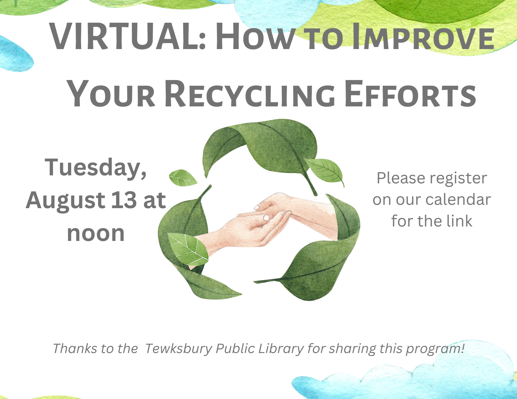 VIRTUAL: How to Improve Your Recycling Tuesday, August 13 at 12:00 noon Julia Greene, Municipal Assistance Coordinator from the Massachusetts Department of Environmental Protection, will discuss how to cut down on waste and how to recycle correctly. Julia will give practical advice on how you can improve your efforts to reduce, re-use and recycle in your day-to-day life in order to make a positive impact on our environment. Bring your questions as they'll be time for Q&A too. Thanks to the Tewksbury Public Library for sharing this program!