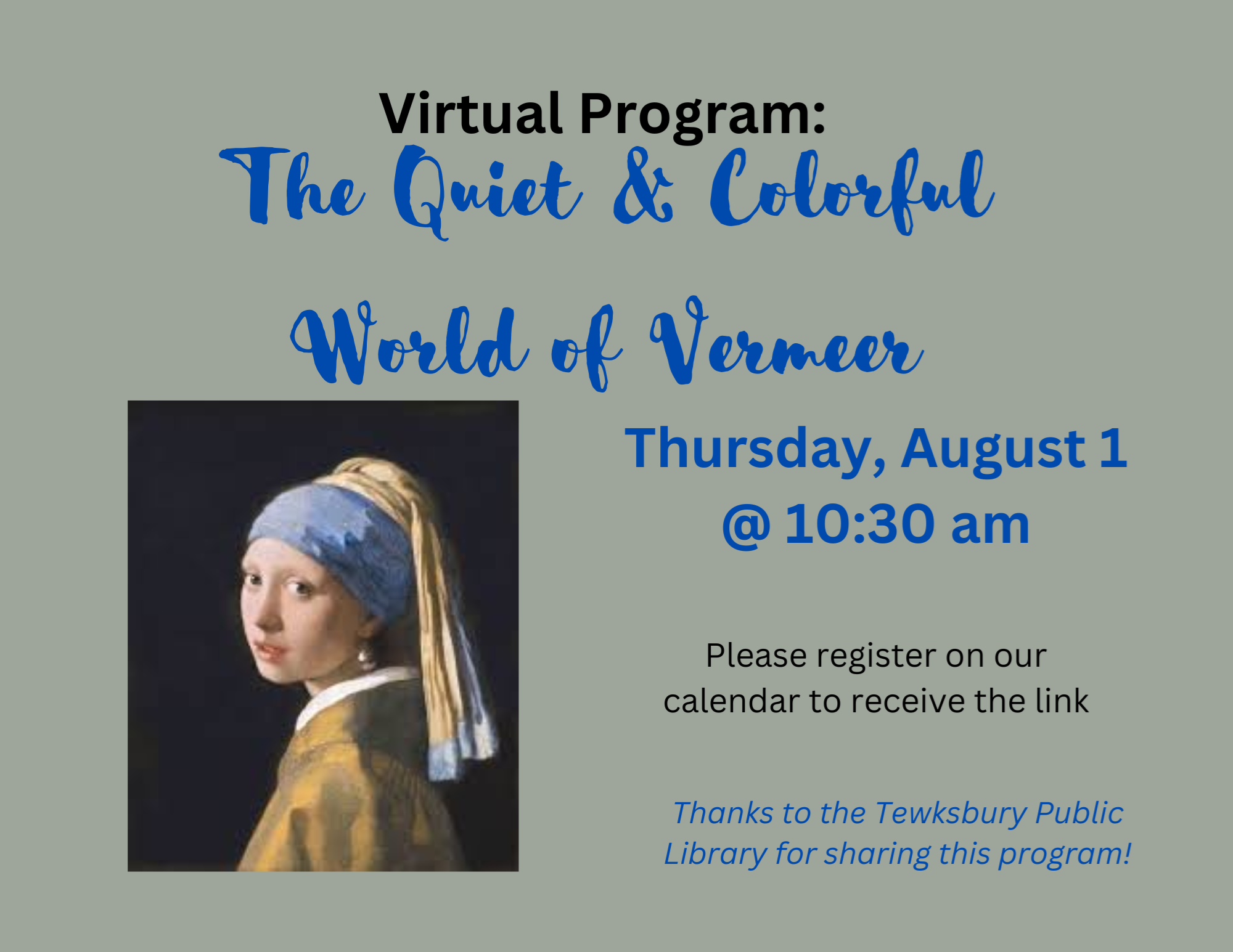 VIRTUAL: The Quiet & Colorful World of Vermeer Thursday, August 1, 10:30 am Johannes Vermeer, who created the iconic painting “Girl with A Pearl Earring,” is considered a world renowned Dutch Master of the 17th century. That painting is one of only 37 works of his that scholars believe survive today. For the first time ever, 28 of those 37 were exhibited in 2023 at the Rijksmuseum in Amsterdam. Learn the latest insights into this beloved but enigmatic artist. Led by art historian Mary Woodward, a guide at several Historic New England properties. She previously served as Public Programs Coordinator and Educator at the Concord Museum. Thanks to the Friends of the Tewksbury Public Library and Corning Community Impact & Investment for sharing this program!