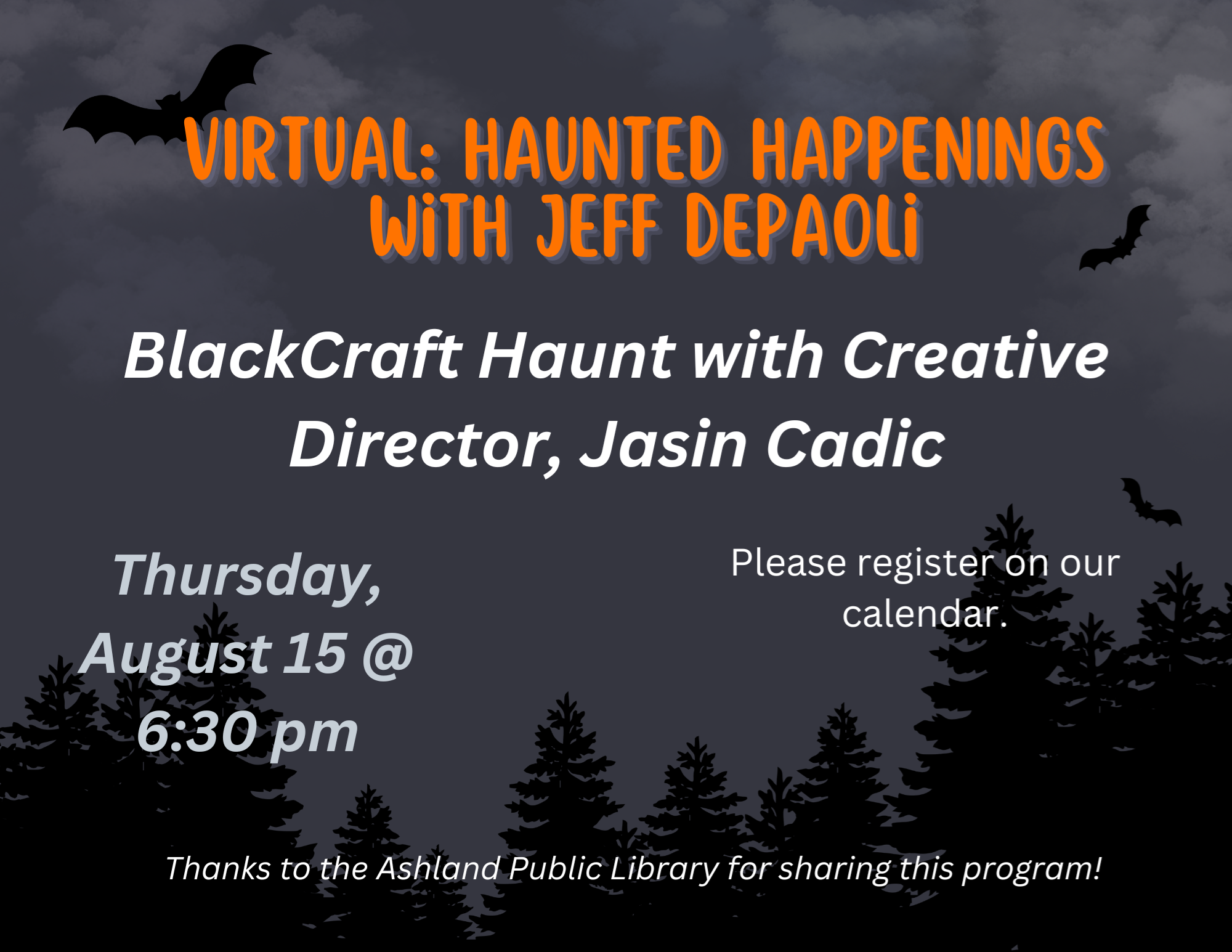 VIRTUAL: Haunted Happenings with Jeff DePaoli : BlackCraft Haunt with Creative Director, Jasin Cadic Thursday, August 15 at 6:30 pm BlackCraft Haunt, touted as Salem's best rated Haunted House, located in the heart of Downtown Salem, MA, is our next adventure. Join Jasin Cadic, Creative Director of BlackCraft Haunt, and Jeff DePaoli, host of "That Halloween Podcast", as they talk all about this fantastic haunted place right in our backyard!! Thanks to the Ashland Public Library for sharing this program!
