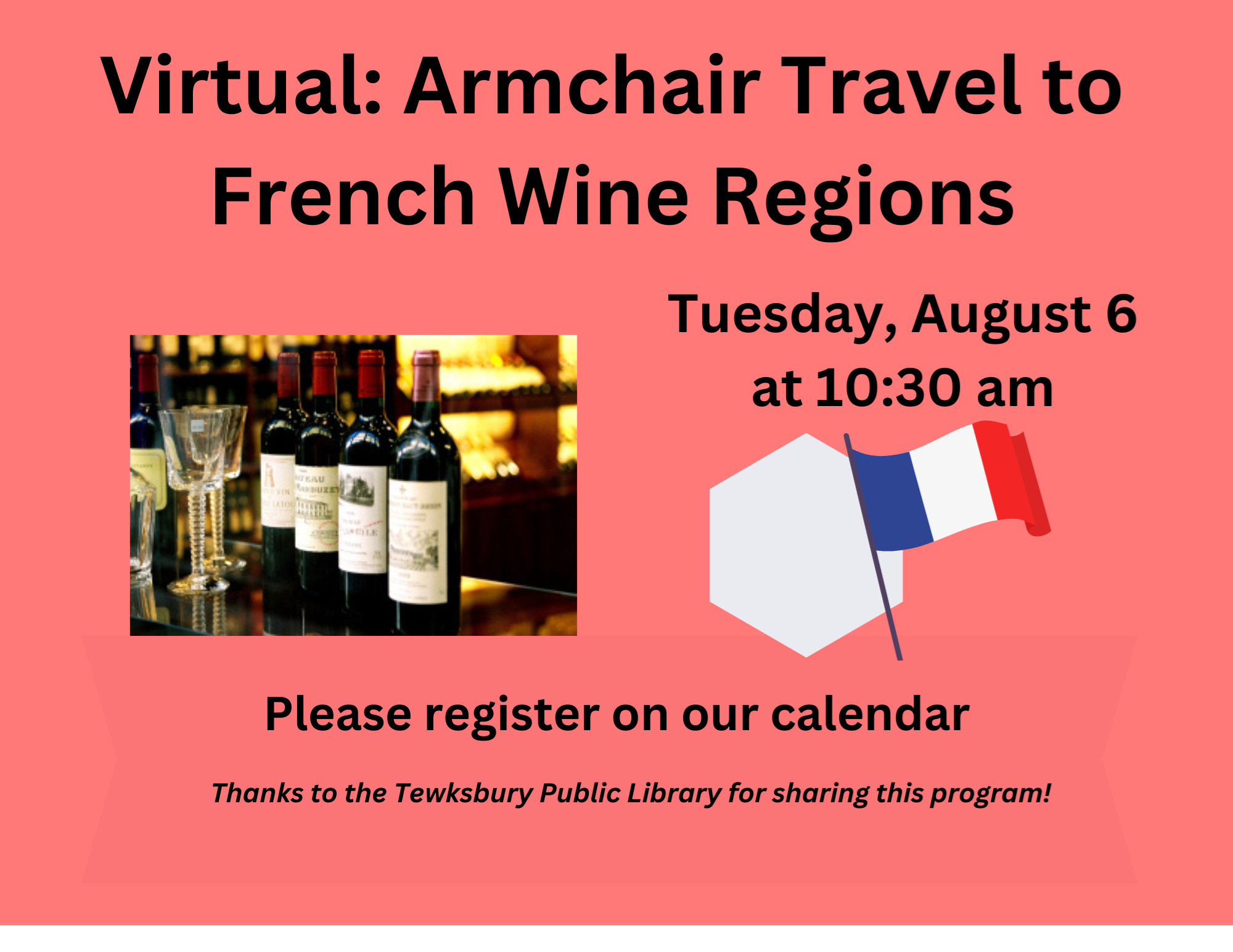VIRTUAL: Armchair Travel to French Wine Regions Tuesday, August 6, 10:30 am France has 17 different wine regions, each with unique wines, history, and a strong cultural identity. Explore the sites and wines of Provence, Cote du Rhone, and Burgundy. The wines are excellent, and the residents are very welcoming. Led by Gene Flynn, an Illinois native, who has taught at the College of Lake County and Harper College, and serves on the board of the Institute for Continued Learning at Roosevelt University. He frequently gives travel presentations to libraries and senior centers around the country. Thanks to the Friends of the Tewksbury Public Library and Corning Community Impact & Investment for sharing this program!