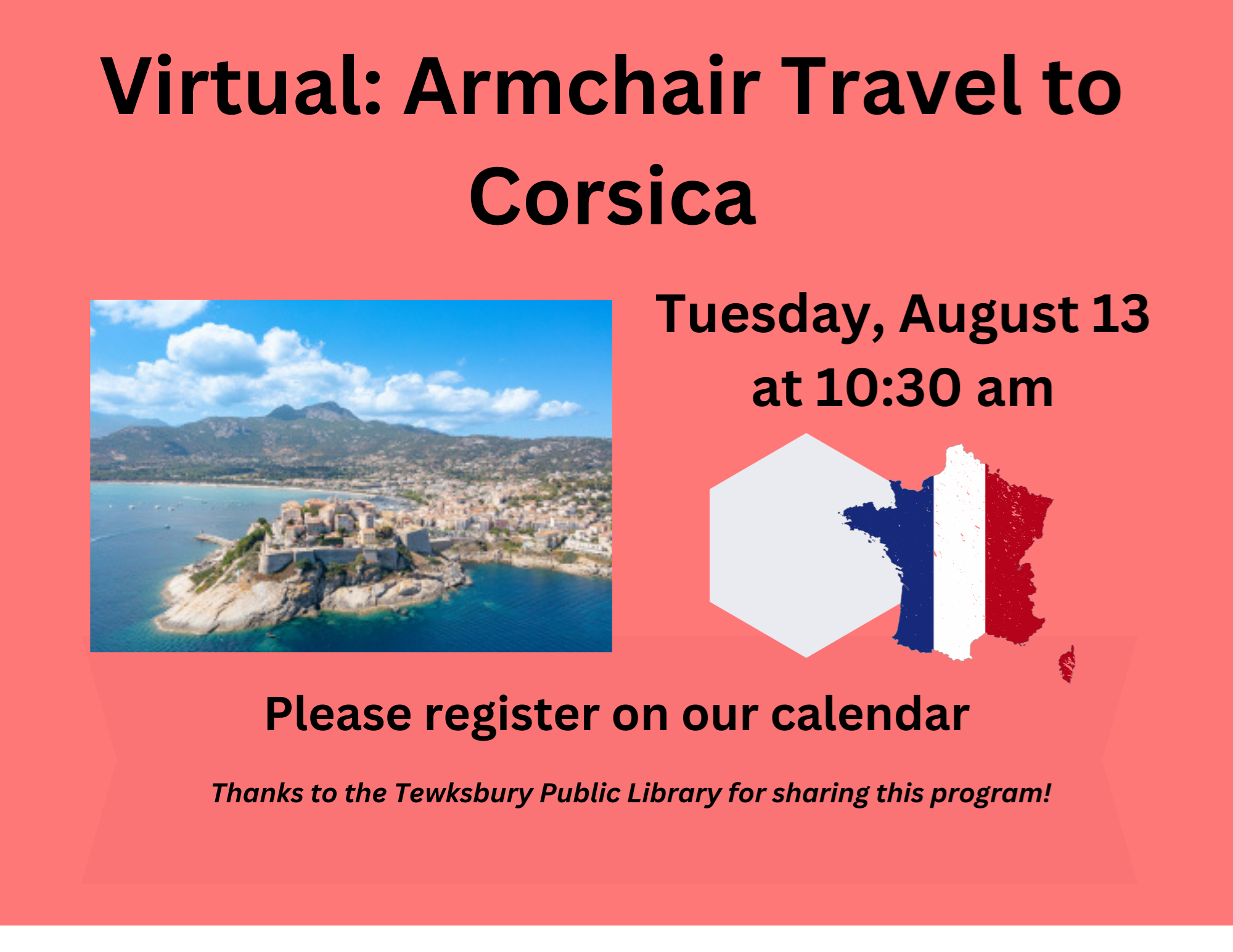VIRTUAL: Armchair Travel to Corsica Tuesday, August 13 at 10:30 am Travel to Corsica, the jewel of the Mediterranean. Mountains and beaches beckon travelers. Politically, it is a French Department. Historically, it is tied to Genoa. Corsica is a free spirit in the Ligurian Sea with a French Mediterranean flavor and a Genoese nod. The combination of culture and scenery make it a very interesting destination. Led by Jack Holmes, a travel photographer and owner of "Images From Near and Far" at Western Avenue Studios in Lowell. A retired high school teacher, he previously served as President of the Greater Lynn Photographic Association and Gallery Manager of the Loading Dock Gallery in Lowell. Thanks to the Friends of the Tewksbury Public Library and Corning Community Impact & Investment for sharing this program!
