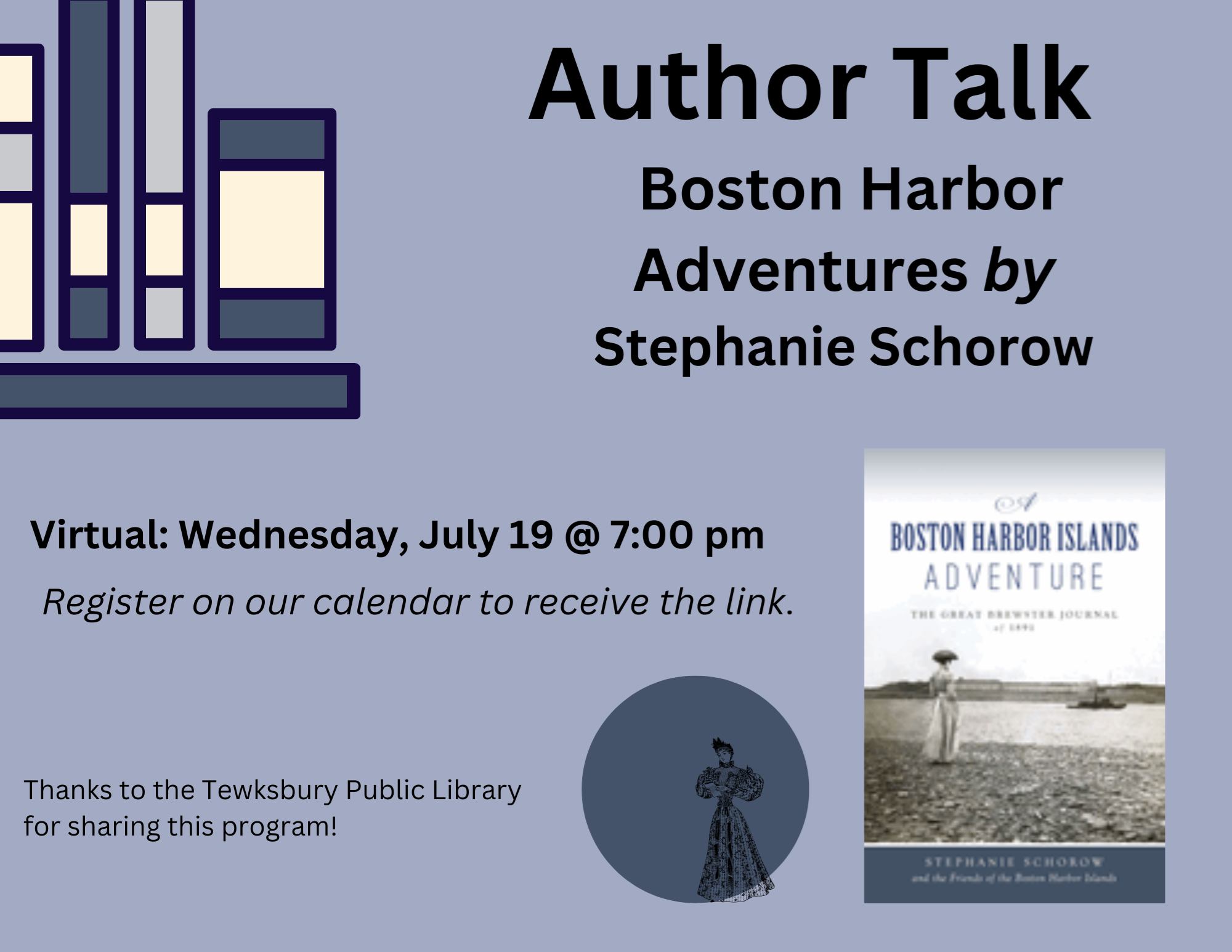 VIRTUAL AUTHOR TALK: A Boston Harbor Islands Adventure Wednesday, July 19 @ 7:00 pm Author Stephanie Schorow will discuss her new book, A Boston Harbor Islands Adventure: The Great Brewster Journal of 1891, in this ZOOM webinar. In July 1891, four intrepid women from Lowell, Massachusetts, set off for Great Brewster Island in Boston Harbor for an adventure they would remember all their lives. Schorow is a veteran journalist who has worked for the Boston Herald, the Associated Press, and other media.