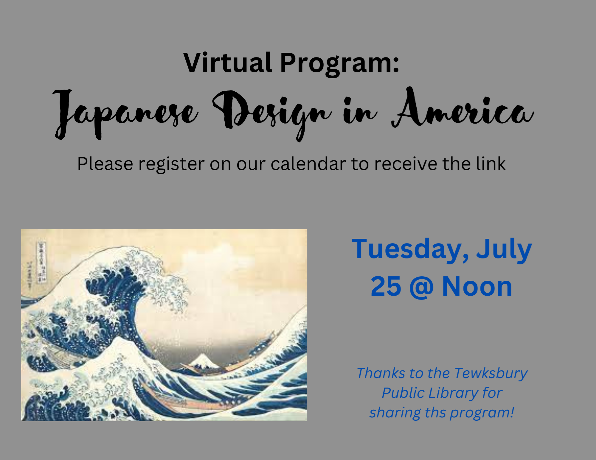 WEBINAR: Japanese Design in America with Historic New England Tuesday, July 25 @ noon In 1854, American Commodore Matthew Perry forcibly reopened Japan’s ports to international trade after two centuries of virtual isolation. Soon after, Japanese lacquers, fans, textiles, prints, and ceramics flooded the Western market, attracting the attention of prominent collectors such as Isabella Stewart Gardner and artists like James McNeill Whistler. The ensuing “Japan Craze” in America also provided fresh inspiration for manufacturers. Led by Erica Lome, Associate Curator at Historic New England. She was previously the Peggy N. Gerry Curatorial Associate at the Concord Museum. NOTE: This program will be recorded. All registrants will receive the recording via email within 24 hours of the program. Thanks to the Tewksbury Public Library for sharing this program!