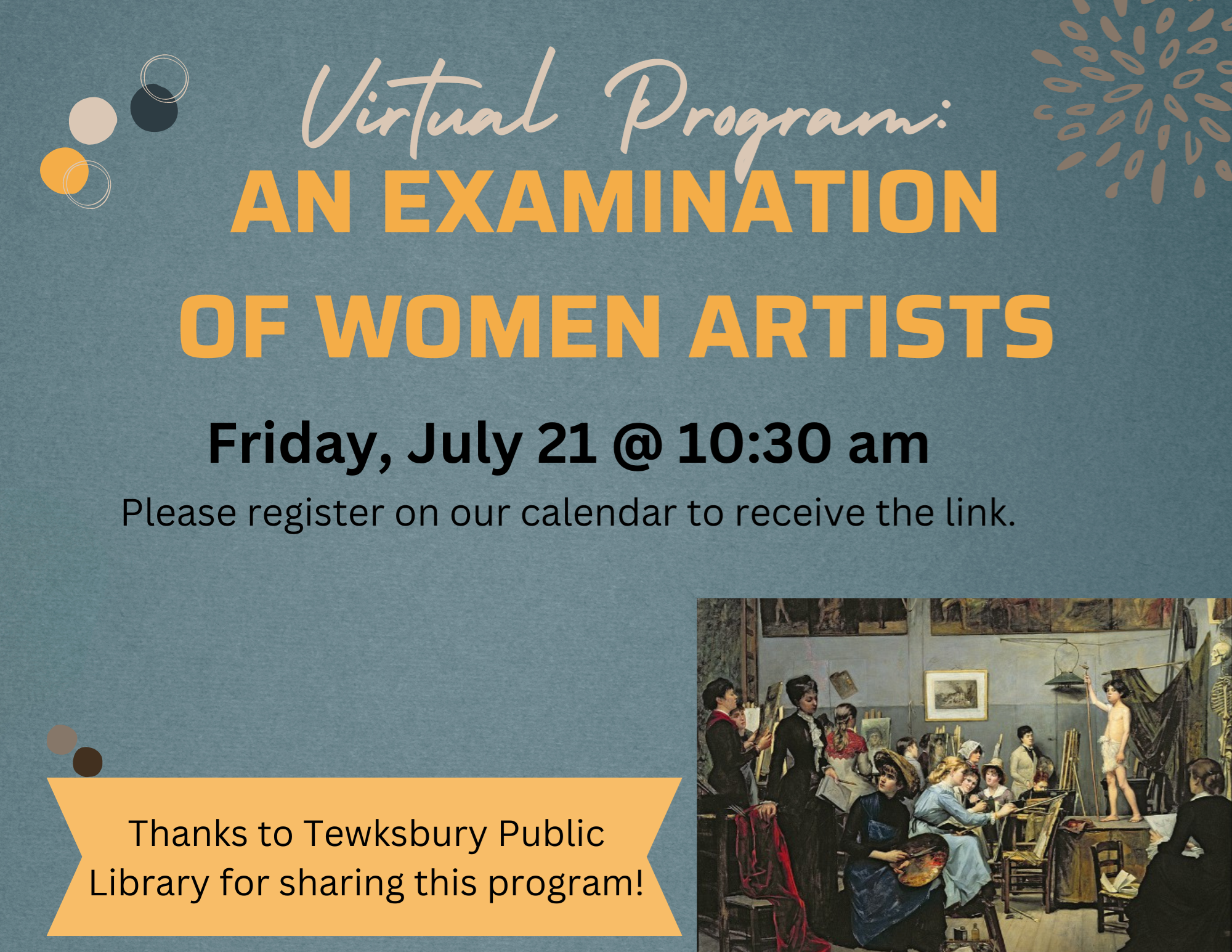 WEBINAR: An Examination of Women Artists (Renaissance Through 19th Century) Friday, July 21 @ 10:30 am Join us for a look and a discussion about the women who have defied convention to make art from the Renaissance through the 19th century. Led by art instructor Jane Blair, founder of ArtMatters. She has a BFA from Boston University and a MFA from University of Illinois. Blair has been an art educator in many fine art studio disciplines as well as Art History, Art Appreciation, Computer Art, Photography, and Graphic Illustration. NOTE: This program will be recorded. All registrants will receive the recording via email within 24 hours of the program. Thanks to the Tewksbury Public Library for sharing this program!