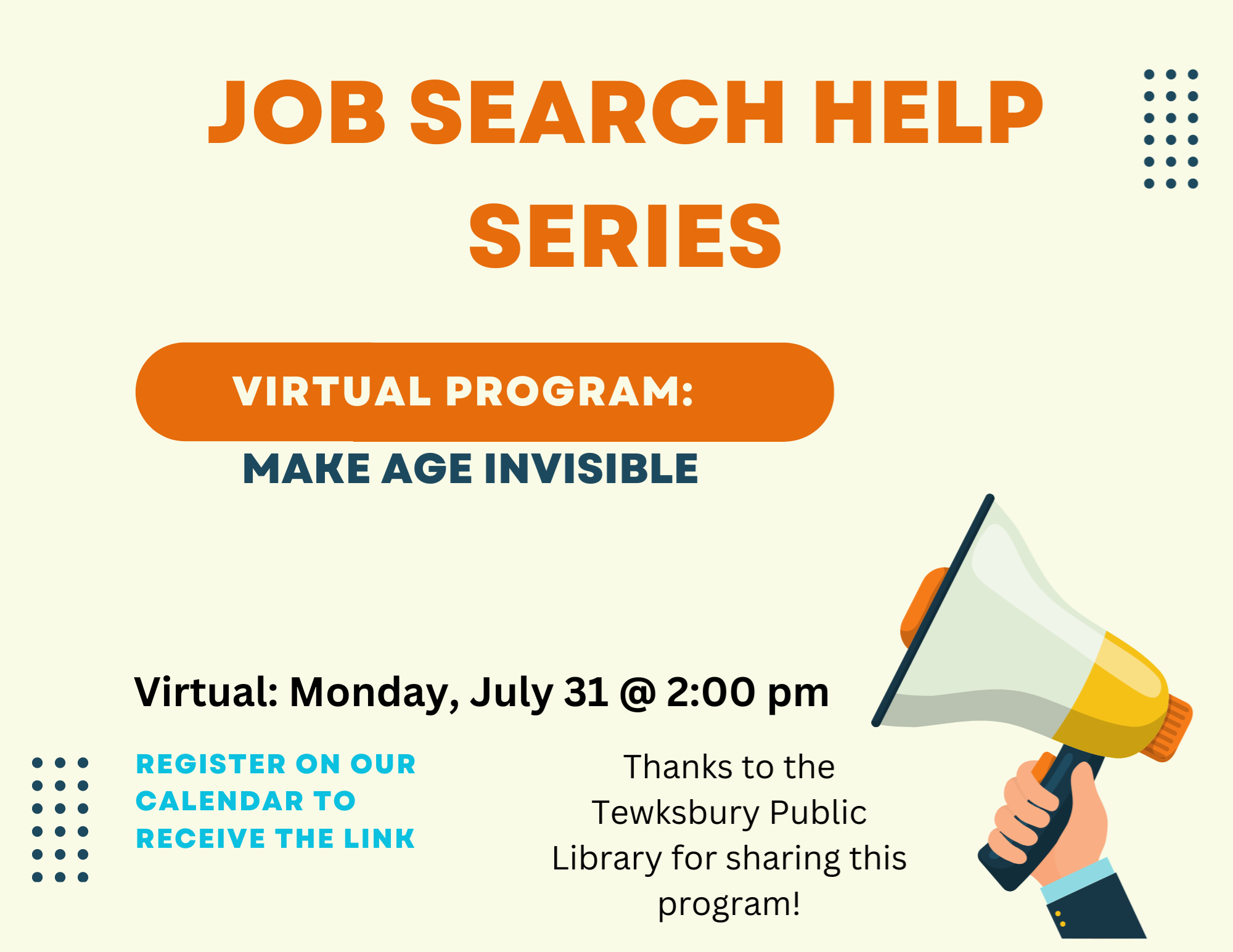 WEBINAR: JOB SEARCH HELP: Make Age Invisible Monday, July 31 @ 2:00 pm Age can influence hiring decisions in subtle and often undisclosed ways. This talk and discussion will describe what a job seeker can do to minimize or eliminate the negative influence of age. Led by Randall Warniers, a freelance editor, book designer, and book publisher who spent nearly two decades in the world of publishing as managing editor of a research journal at MIT Lincoln Laboratory. NOTE: This program will be recorded. All registrants will receive the recording via email within 24 hours of the program. Thanks to the Tewksbury Public Library for sharing this program!