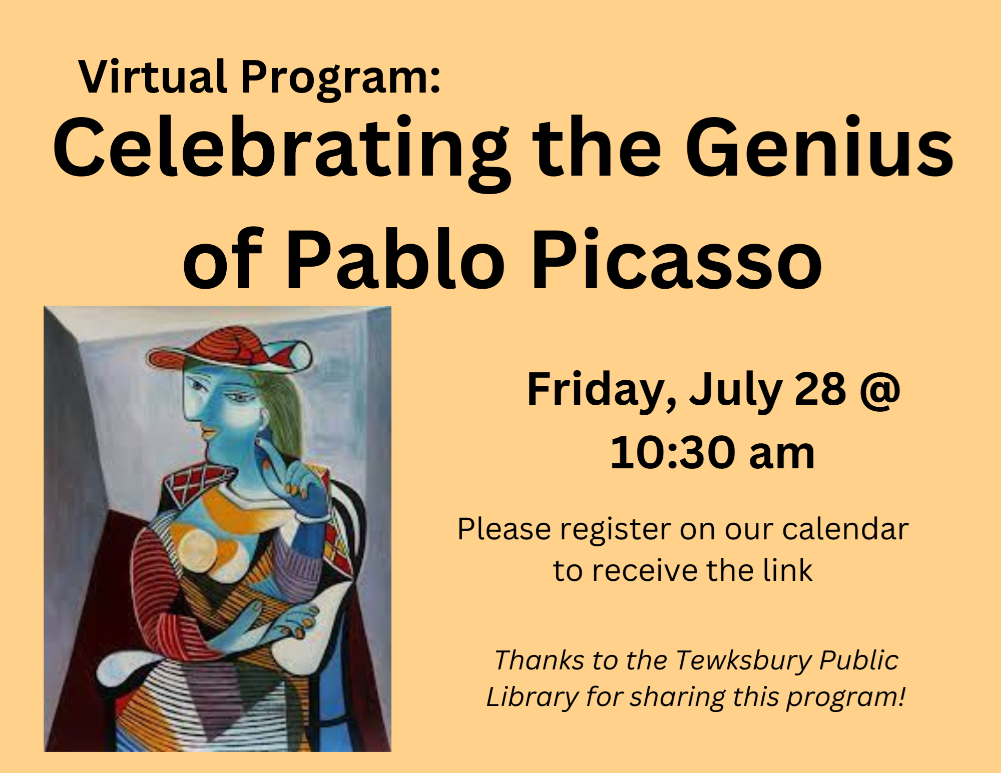 WEBINAR: Celebrating The Genius Of Pablo Picasso Friday, July 28 @ 10:30 am 2023 marks the 50th anniversary of the death of Pablo Ruiz Picasso, the artistic genius born in Malaga, Spain at the beginning of the 20th century. Throughout 2023, exhibitions, initiatives, and events are being held around the world to commemorate his life and work. Join arts educator Janet Mandel to learn about Picasso’s inexhaustible creativity and explore his tumultuous life, revealed through beautiful images of his major paintings and sculptures. NOTE: This program will be recorded. All registrants will receive the recording via email within 24 hours of the program. Thanks to the Tewksbury Public Library for sharing this program!
