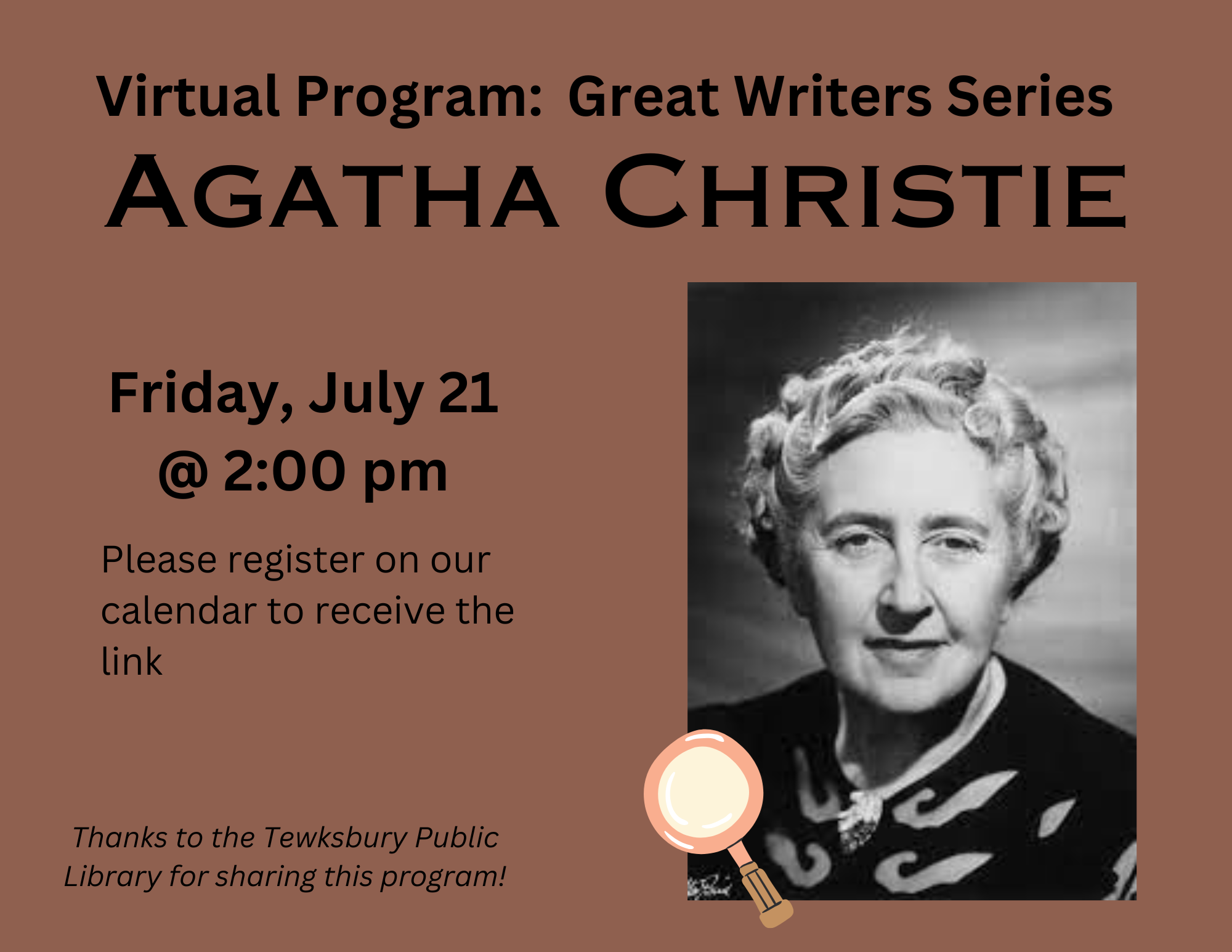 WEBINAR: Great Writers: A Look At The Life & Works of Agatha Christie Friday, July 21 @ 2:00 pm Agatha Christie is the most famous mystery writer in the world. In fact, the Guinness Book of World Records goes further and lists Christie as the best-selling novelist of all time. Who was this remarkable woman? How did she come to write her indelible works? Why is she still such a popular literary figure? These and other questions will be explored along with a real life mystery about Christie’s dramatic disappearance in 1926 that remains substantially unsolved to this day. Led by Dr. Bill Thierfelder, a retired college professor who has taught at a variety of Arts and Humanities courses for 32 years at several New York universities and colleges, including St. John's University and Dowling College. NOTE: This program will be recorded. All registrants will receive the recording via email within 24 hours of the program. Thanks to the Tewksbury Public Library for sharing this program!