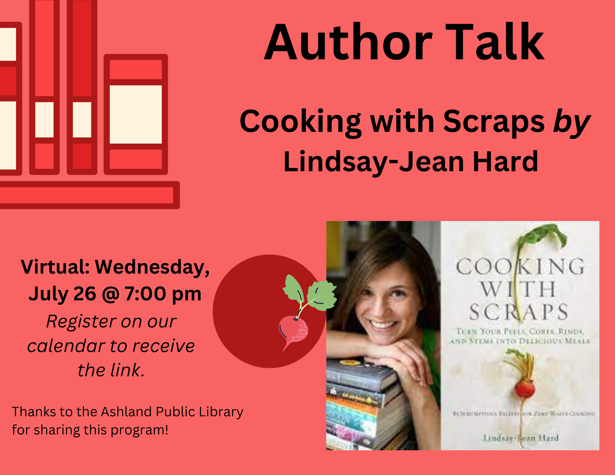VIRTUAL AUTHOR TALK: Cooking with Scraps Wednesday, July 26 @ 7:00 pm Join us for a virtual Q&A with the Food Network's Lindsay-Jean Hard. Consider this a (delicious) hands-on bootcamp where you’ll learn just how versatile underutilized produce parts can be through hands-on instruction from Lindsay-Jean. You’ll leave with a waste-reducing mindset, new back pocket recipes, and the fruits of your labor—scrappy, delicious food to take home with you! Register here to receive the link. Thanks to Ashland Public Library for sharing this program!