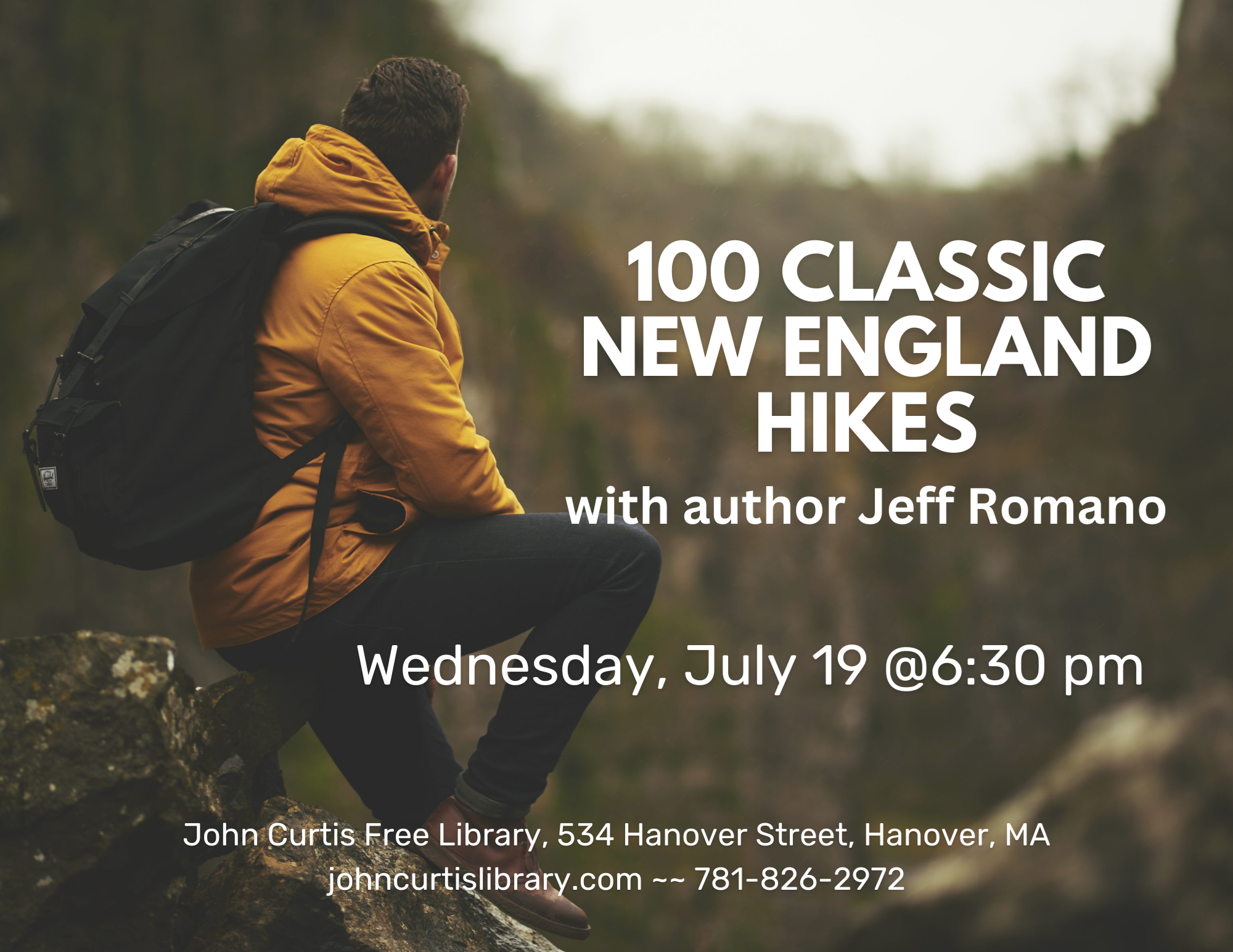 Author Talk: 100 Classic New England Hikes with Jeff Romano Wednesday, July 19 @ 6:30 pm IN PERSON! Join author Jeff Romano for a slideshow presentation showcasing hiking opportunities throughout New England. The program will cover destinations in all six states with a focus on itineraries featured in his latest guidebook, an updated edition to 100 Classic New England Hikes (June 2023). Jeff will share advice, provide insights, and answer questions on how and where to plan your next hiking adventure, information on wildflowers, birds, wildlife, history, & conservation success stories.