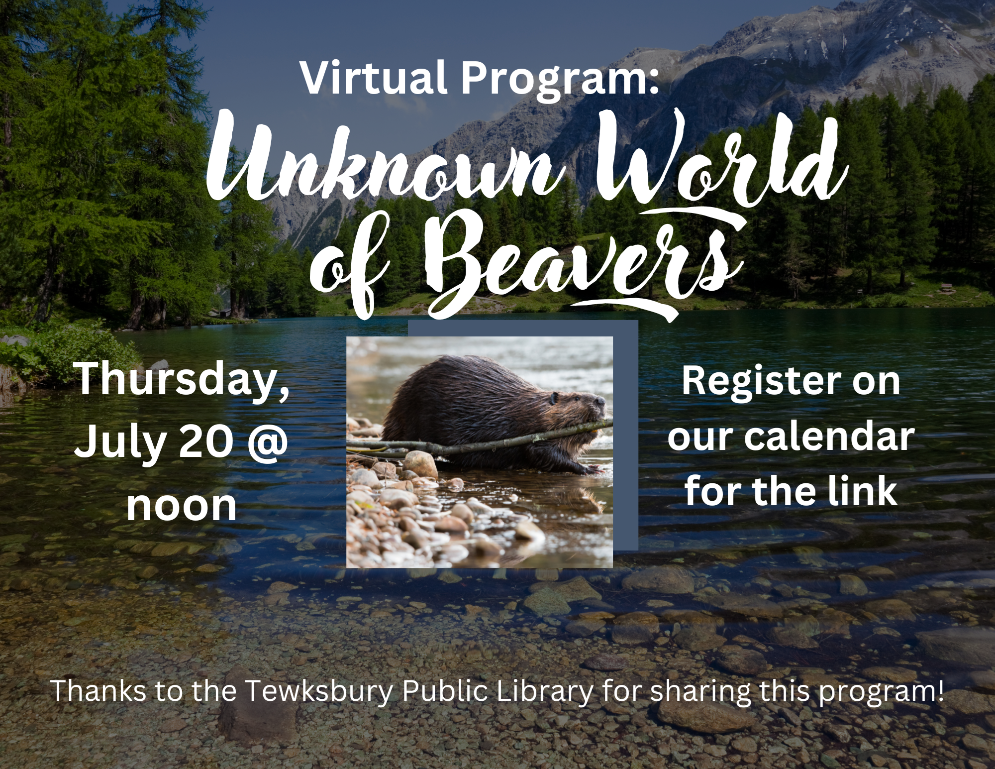 WEBINAR: Discover The Unknown World Of Beavers With The Mass Audubon Thursday, July 20 @ noon The American Beaver is an incredible wetland engineer and can be found throughout Massachusetts transforming their habitats. This online presentation will cover beaver family life, range, lodge and dam maintenance, and how they contribute to the biodiversity of open spaces. Led by Scott Santino, the Education Manager and Teacher Naturalist at the Ipswich River Wildlife Sanctuary in Topsfield. NOTE: This program will be recorded. All registrants will receive the recording via email within 24 hours of the program. Thanks to the Tewksbury Public Library for sharing this program!