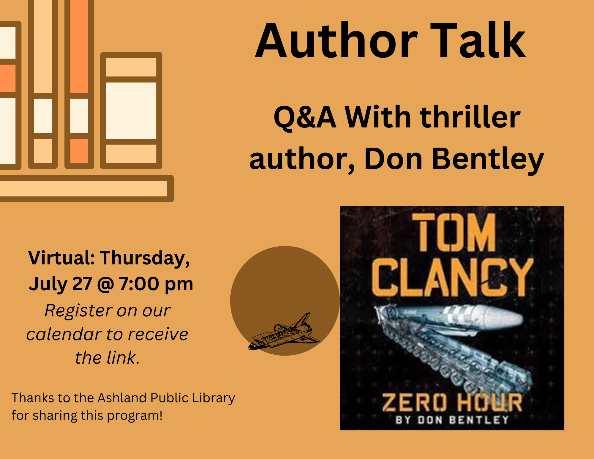 WEBINAR: Author Talk with Don Bentley Thursday, July 27 @ 7:00 pm Don Bentley is the New York Times Bestselling author of the Matt Drake series and two Tom Clancy Jack Ryan, Jr. novels. His latest book, "Forgotten War" is described as an "unforgettable read" by Nelson DeMille. We hope you can join us for what will be an amazing and fascinating conversation with Don! Register here to receive the link. Thanks to the Ashland Public Library for sharing this program!
