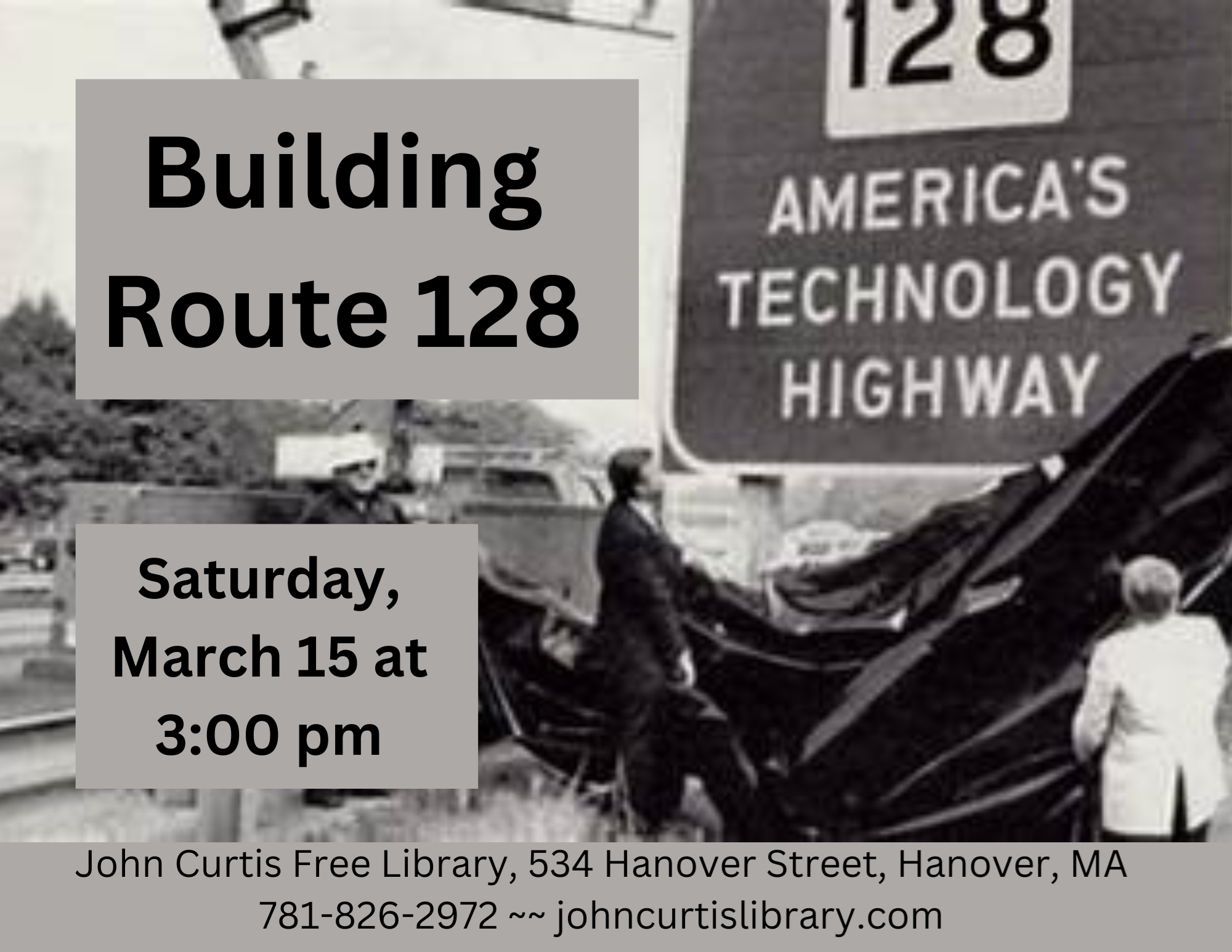 Building Route 128 Saturday, March 15 at 3:00 pm David Kruh, co-author of Building Route 128, will discuss the building of this iconic roadway that we love to hate! No registration required.