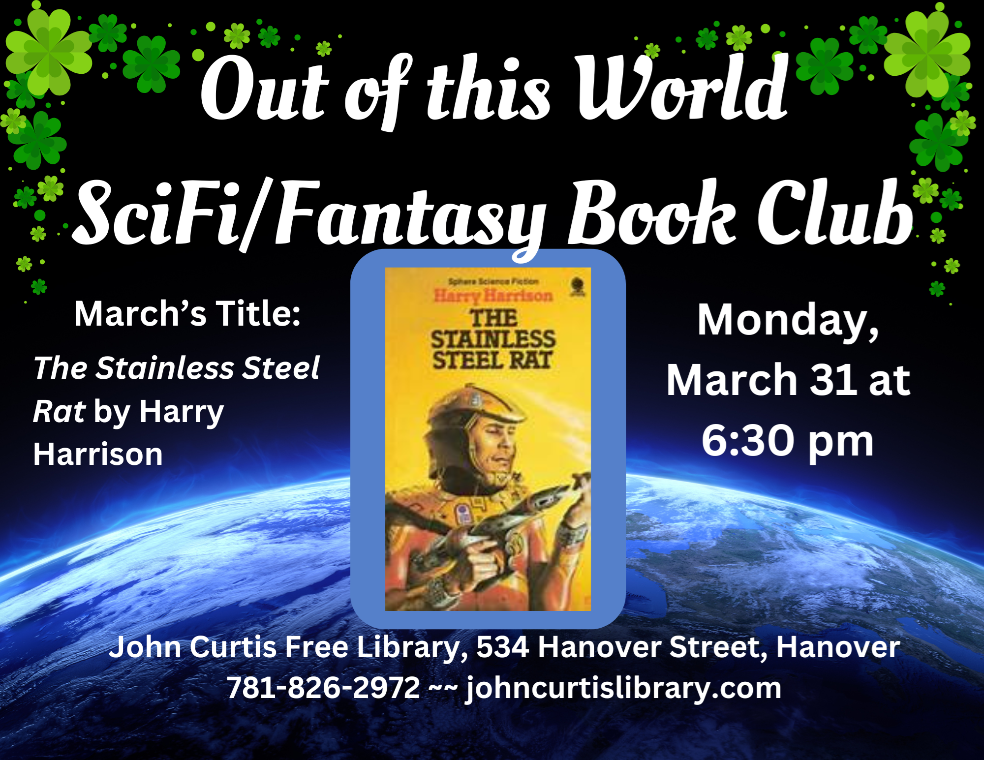Out of This World Science Fiction/Fantasy Book Club Monday, March 31 at 6:30 pm Join us for the Out of This World Science Fiction / Fantasy Book Club! We meet on the last Monday of the month, and alternate between science fiction and fantasy titles. The title for March is The Stainless Steel Rat by Harry Harrison