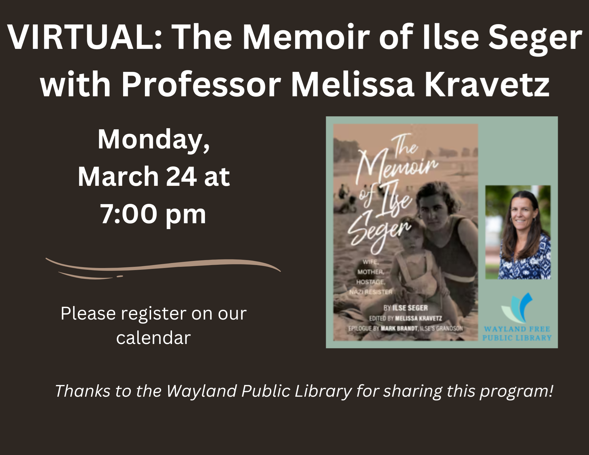 VIRTUAL: The Memoir of Ilse Seger with professor Melissa Kravetz Monday, March 24 at 7:00 pm The Memoir of Ilse Seger: Wife, Mother, Hostage, Nazi Resister is a gripping narrative of adventure and intrigue about the wartime life and resistance of an ordinary, decent woman. Elisabeth "Ilse" Seger was the wife of Gerhart Heinrich Seger, a German Social Democratic member of the Reichstag from 1930 to 1933. Ilse tells Gerhart's story, but more importantly, she tells her own story: of her early resistance to the Nazi regime as a political opponent herself; of her solidarity with the Jews during the early years of Nazi persecution; of her defiance of expectations for women at the time; of her time as a hostage alongside her daughter, Renate, in Rosslau concentration camp and how they got out with help from members of Parliament; and, lastly, of her first years living in exile in France and Switzerland as her husband went on an anti-fascist speaking tour in the US. Melissa Kravetz is Associate Professor of History and Co-Director of Women's, Gender, and Sexuality Studies at Longwood University. She also teaches at The Alexander Lebenstein Teacher Education Institute at the Virginia Holocaust Museum. She is author of Women Doctors in Weimar and Nazi Germany: Maternalism, Eugenics, and Professional Identity. Thanks to Wayland Public Library for sharing this program!