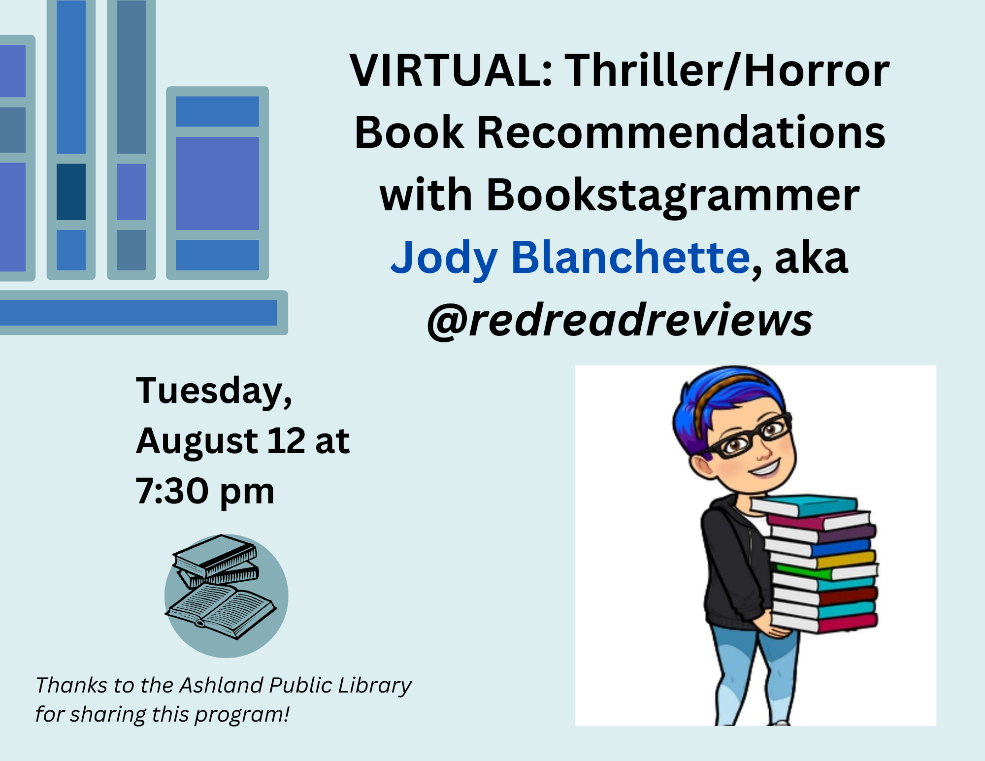 VIRTUAL: Thriller/Horror Book Recommendations with Bookstagrammer, Jody Blanchette, aka @redreadreviews Tuesday, August 12 at 7:30 pm Not sure what to read next? Join Jody (aka @RedReadReviews) for 30 minutes of pure book recommendations - every genre and interest! We're sure you'll find something to like from Jody's many enthusiastic reviews. Jody is an Instagram reviewer and Book Club leader. Lover of all books! We know that Jody will travel far and wide to meet the authors she loves, reads voraciously, and talks about books as if they are her best friends. We can't wait to hear what she'll be recommending - be ready for your TBR pile to fall over! We'll send out a list of all recommendations for those who register. Thanks to the Ashland Public Library for sharing this program!