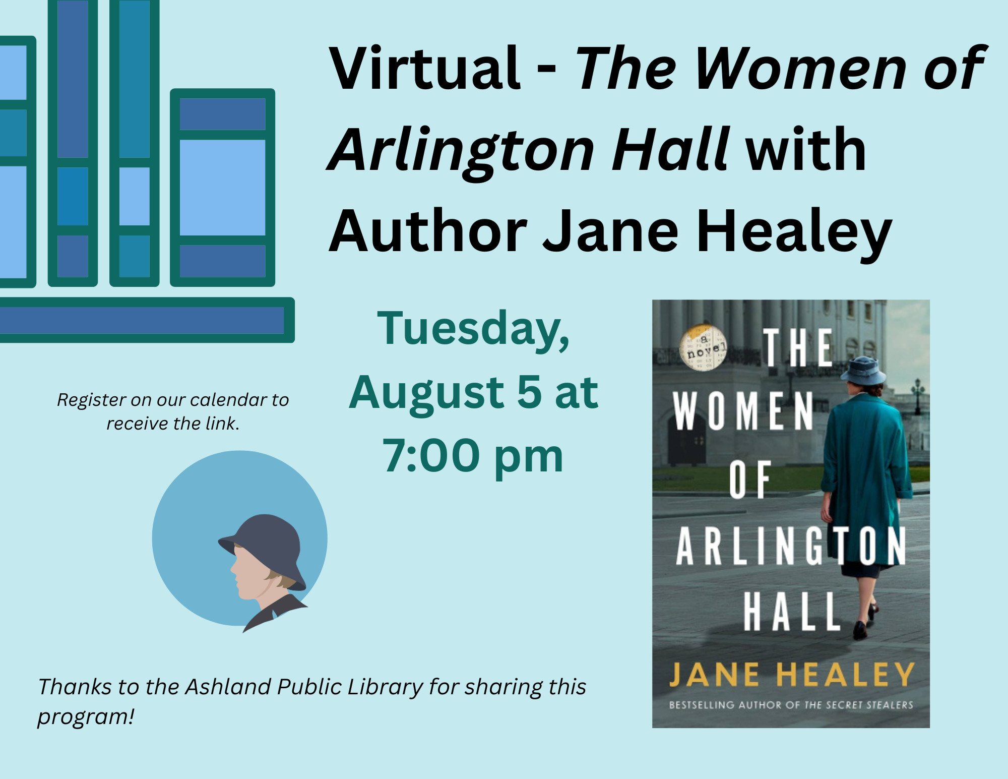 VIRTUAL: The Women of Arlington Hall with Author Jane Healey Tuesday, August 5 at 7:00 pm You all know how much we love author Jane Healey, one of the best historical fiction writers our there! So, we're thrilled to be hosting her for a conversation on her most recent release, "The Women of Arlington Hall". Using her signature deep dive into research and her wonderful ability to tell a riveting story, Jane delves into the life of a female codebreaker who puts her future and her heart on the line in a stirring novel about love, loyalty, betrayal, and Cold War spy games. You're not going to want to miss this one! RECORDING NOTE: This program will be recorded. All registrants will receive the recording via email within 48 hours of the program. Jane Healey is the author of The Saturday Evening Girls Club, Goodnight from Paris, The Secret Stealers, and The Beantown Girls, a Washington Post and Amazon Charts bestseller. Her next novel, The Women of Arlington Hall, releases in August 2025. She is also the host of the Historical Happy Hour podcast, where she interviews fellow historical fiction authors about their latest novels. Thanks to the Ashland Public Library for sharing this program!