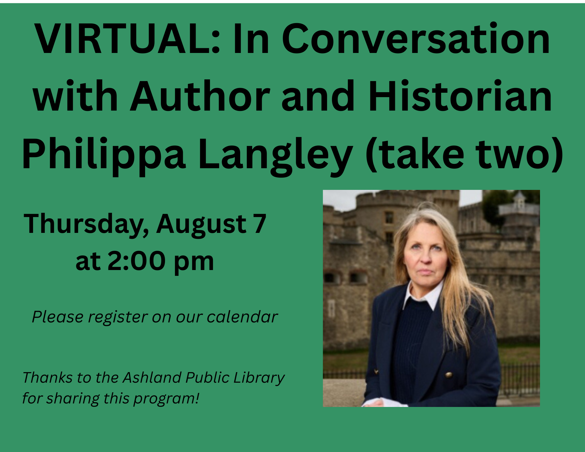 VIRTUAL: In Conversation with Author and Historian Philippa Langley (Take Two) Thursday, August 7 at 2:00 pm We had so much fun talking with Philippa earlier in the year that we just had to have her back. We dug deeply into "The Princes in the Tower: Solving History's Greatest Cold Case" but we had no time to discuss the King Richard Project! So, this time, we're focusing on Philippa's discovery of the grave of King Richard III in 2012. Join us as author and historical sleuth, Philippa Langley, discusses her research methods, her team, her findings, and how solving this mystery affects our understanding of the royal monarchy (in the 1500s, of course). NOTE: This program will NOT be recorded. Thanks to the Ashland Public Library for sharing this program!