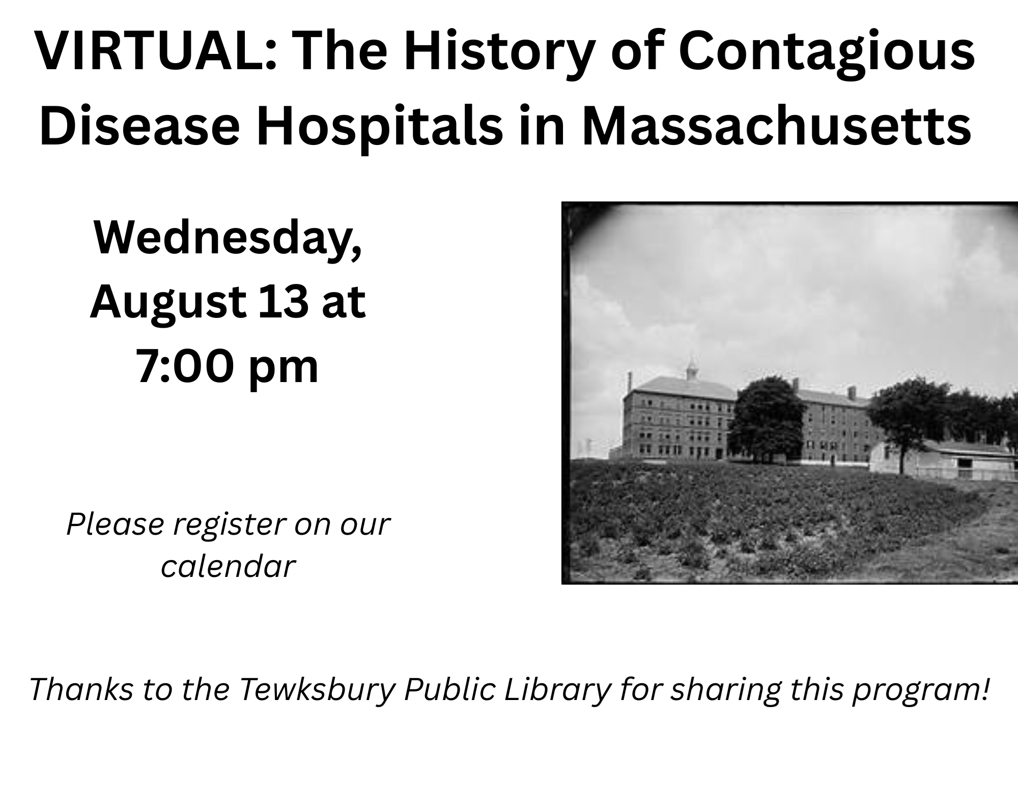 VIRTUAL: The History of Contagious Disease Hospitals in Massachusetts Wednesday, August 13 at 7:00 pm Explore the complex history of contagious disease hospitals in Massachusetts from the 19th to the early 20th century, highlighting their role in shaping public health policy, immigration control, and institutional development. Often located near poorhouses, asylums, and prisons, these hospitals reveal how fear of contagion intersected with social reform, nativism, and evolving ideas about poverty and public responsibility. Led by Dr. Katherine M. (Anderson) Benson, MFA, EdD, an institutional historian and award-winning author. She has been a special educator for more than twenty years in residential treatment facilities, juvenile corrections, and therapeutic programs. Dr. Benson has written about and lectured on the history of institutional treatment in Massachusetts. RECORDING NOTE: This program will be recorded. All registrants will receive the recording via email within 48 hours of the program. Thanks to the Tewksbury Public Library for sharing this program!
