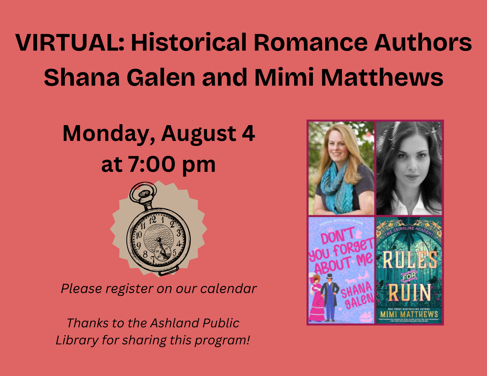 VIRTUAL: Historical Romance Authors Shana Galen & Mimi Matthews Monday, August 4, 2025 We're such fans of historical romance and we're huge fans of Shana Galen and Mimi Matthews! We can't wait to be in conversation with them as they discuss their books, writing, and the state of historical fiction in publishing. Shana's most recent book is "Don't You Forget About Me" and Mimi's upcoming one is "Rules for Ruin" - different but amazing! Hope you can join us. Shana Galen is an award-winning writer and bestselling author of over fifty historical romances. Mimi Matthews is a USA Today bestselling, award-winning author of historical romances. Thanks to the Ashland Public Library for sharing this program!