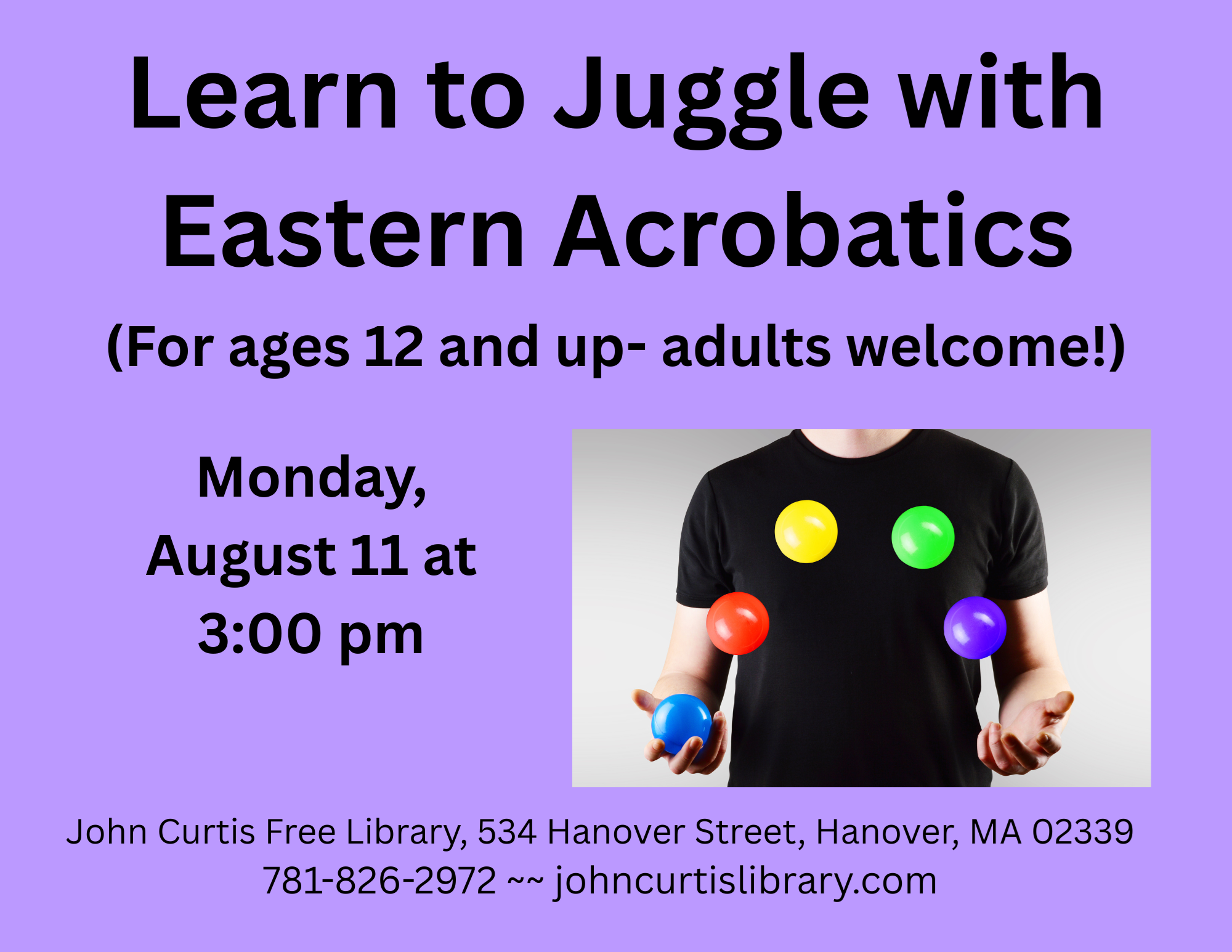 IN PERSON: Learn to Juggle for ages 12 and up! Adults Welcome! Monday, August 11 at 3:00 pm Join Eastern Acrobatics and learn to juggle - a fun skill for anyone! EAC (@easternacrobatics) offers a unique opportunity to work with expert coaches to build incredible strength and flexibility, discover hidden talent; they have a motivational environment within its beautiful church facility at the former Sacred Heart church in South Natick.