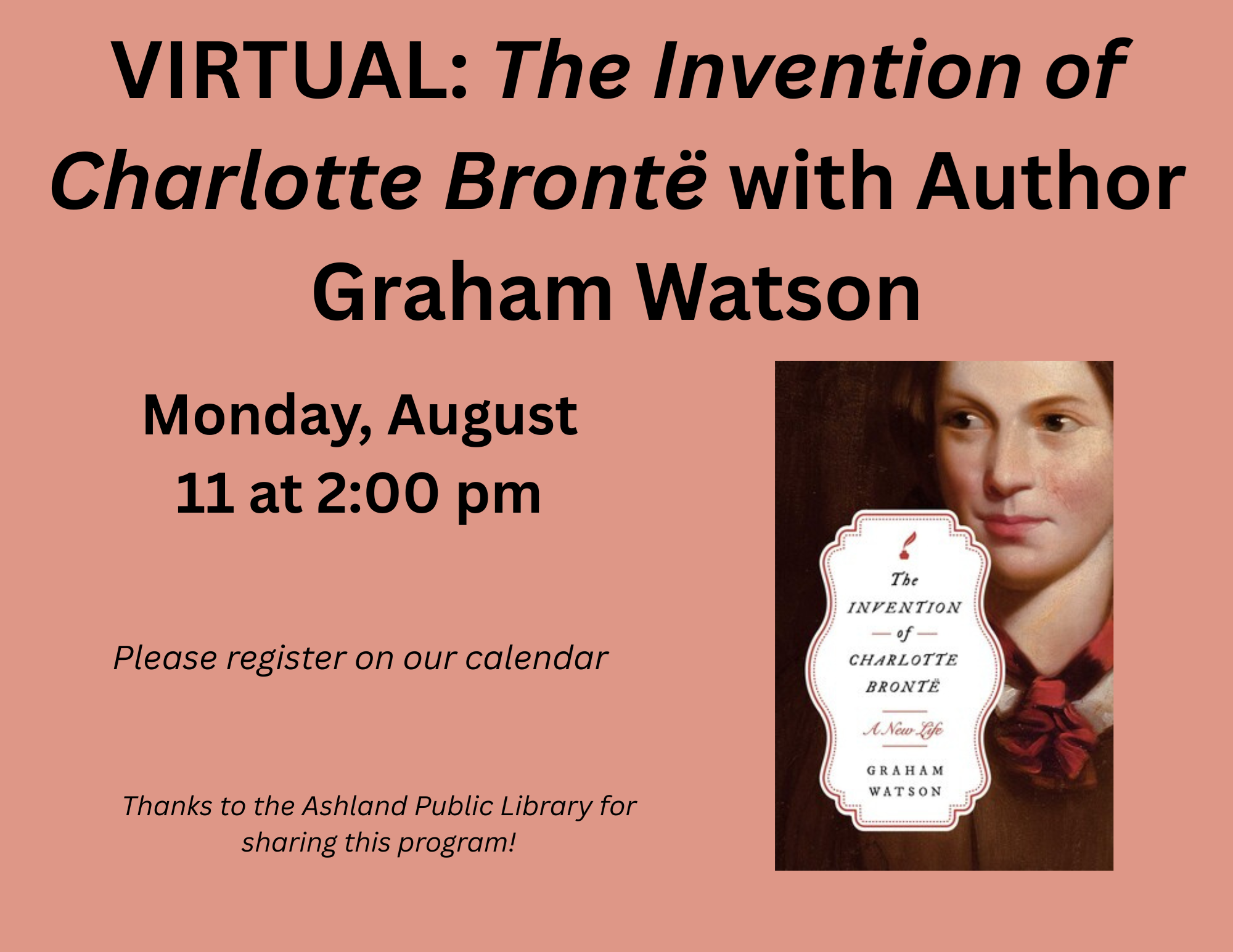 VIRTUAL: The Invention of Charlotte Bronte with Graham Watson Monday, August 11 at 2:00 pm Based entirely on rarely seen private letters, The Invention of Charlotte Brontë: A New Life by Graham Watson sheds new light on the dramatic events of Brontë’s turbulent last years of grief, fulfillment, and tragedy—and exposes the astonishing media scandal that followed her early death, when her friends and family battled to control how history would remember her. Join us as Graham discusses Charlotte's life, writing, and death as well as his own research and writing of this book! Graham Watson is a specialist in the Brontës and Elizabeth Gaskell, and he is currently researching Victorian literary identities at the University of Glasgow. He has published a number of papers in Brontë Studies and has recently joined the journal’s peer-review board. Thanks to the Ashland Public Library for sharing this program!