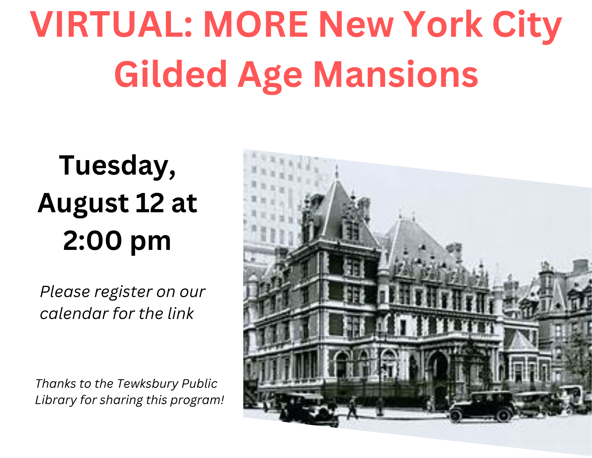 VIRTUAL: More New York City Gilded Age Mansions Tuesday, August 12 at 2:00 pm Explore more of New York’s gilded age mansions in the Upper East Side Carnegie Hill historical district. Nestled between 5th Avenue and 3rd Avenue in the upper 80s and lower 90s, Carnegie Hill is chock full of elegant historic architecture. Highlights include the former Andrew Carnegie mansion, now the Cooper-Hewitt Museum; the former Otto H. Kahn House, now Convent of the Sacred Heart; and the former Warburg Mansion, now The Jewish Museum. Led by Ginny Poleman, owner of New York City Encounters. A graduate of Cornell University, Poleman is a licensed New York City Sightseeing Guide, a trained docent for the Municipal Art Society, and a trained educational guide at Manhattan’s largest art museum. RECORDING NOTE: This program will be recorded. All registrants will receive the recording via email within 48 hours of the program. Thanks to the Tewksbury Public Library for sharing this program!