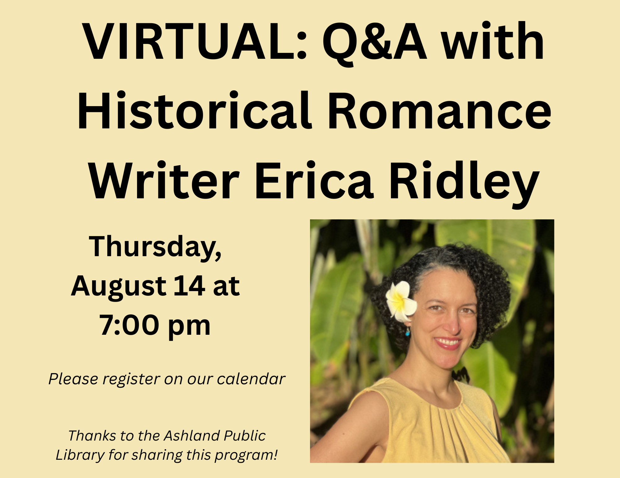 VIRTUAL: Q&A With Historical Romance Writer Erica Ridley Thursday, August 14 at 7:00 pm We are so excited to be chatting with fantastic historical romance author, Erica Ridley! And, right before her new book, A Waltz on the Wild Side, comes out - we can celebrate early! Erica also wrote The Perks of Loving a Wallflower, one of our very favorite books. AND, she also writes young adult horror and thrillers novels. What Can't she do?? Bring your questions as this is going to be a rapid fire, AMA (ask me anything) Q&A! Erica Ridley is a New York Times and USA Today best-selling author of witty, feel-good historical romance novels, including The Duke Heist, featuring the Wild Wynchesters. Thanks to the Ashland Public Library for sharing this program!