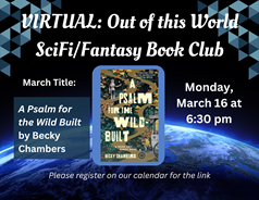 Please register to join us for the Out of This World Science Fiction / Fantasy Book Club! We'll send out a link to registrants on the Friday preceding the last Monday of the month, and alternate between science fiction and fantasy titles. The title for March is A Psalm for the Wild Build by Becky Chambers