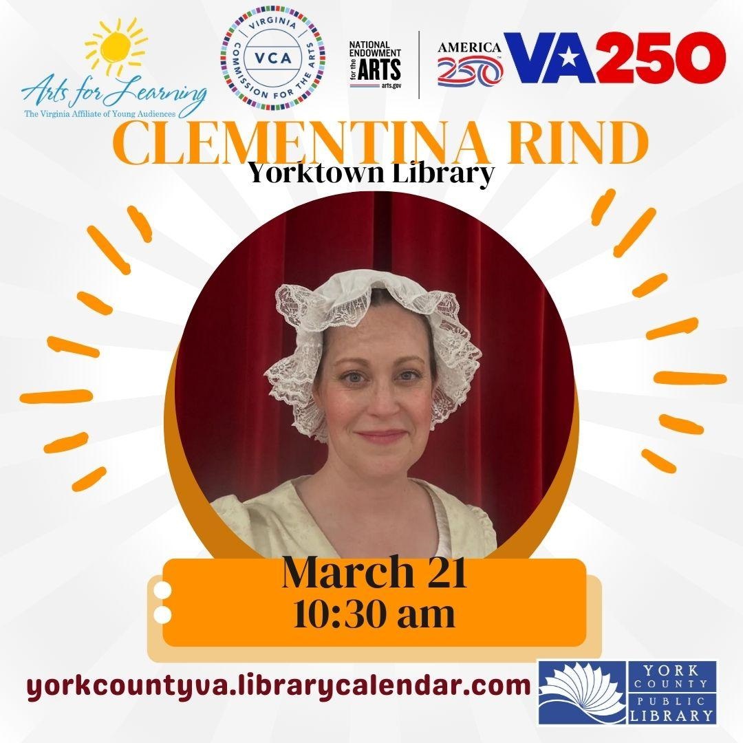 Meet Clementina Rind, Virginia’s first female printer! Arts for Learning Virginia’s Sarah Osburn Brady brings this remarkable woman’s story to life with warmth, wit, and historical flair. All ages are welcome.
