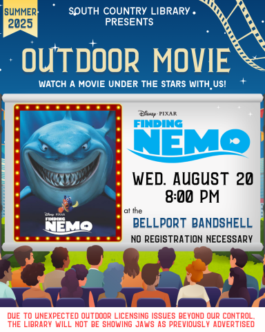 Outdoor Movie: Finding Nemo Wednesday, August 20, 8:00 pm Join us at the Bellport Bandshell as we watch Finding Nemo under the stars. Bring your own seats and snacks! No registration required. *Due to unexpected outdoor licensing issues beyond our control, the library will not be showing Jaws as previously advertised this summer.