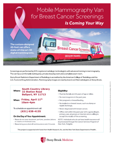 Stony Brook Mobile Mammography Van program Friday, April 11, 10:00 am - 4:00 pm Stony Brook’s fully outfitted Mobile Mammography Van is spacious and features a registration area, a comfortable waiting room, private changing and exam spaces, and state-of-the-art 3D equipment. To schedule an appointment, please call (631) 638-4135. |