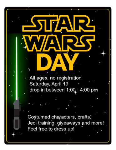 Star Wars Day Saturday, April 19, 1:00 pm - 4:00 pm May the force be with you! Celebrate Star Wars Day with costumed characters, crafts, giveaways, photo ops and Jedi training! Don't miss the back-to-back Star Wars movie screening which begins at 12:00 pm! No registration required.