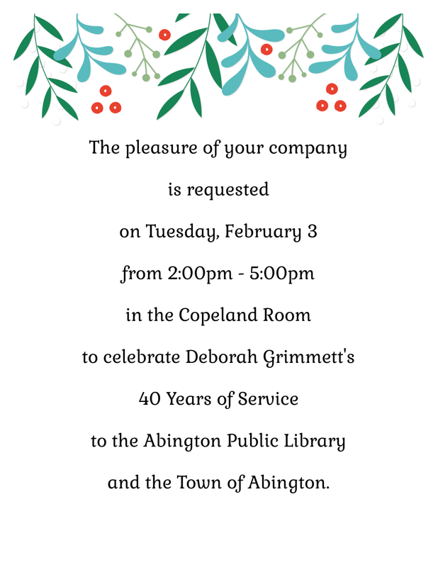 - On Tuesday, February 3 you are invited to join us in the Copeland Room from 2-5 PM as we celebrate Library Director Deborah Grimmett's 40 years of service (and counting) to our community.