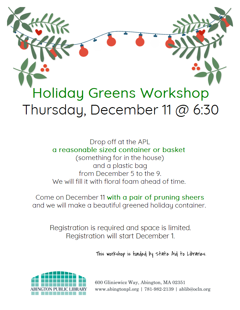 Greens Workshop Thursday, December 11, 6:30 PM Are you ready to do some holiday decorating? Learn how to create festive centerpieces using live, local greens. All you need is a reasonably sized (indoor) basket or container, pruning shears and some imagination. Sandy's greens workshops are always a big hit and space is limited so be sure to register today. We will accept walk-in registration only until 12/4, and then we will open up remaining spots to phone and email requests. Questions? Please refer to our flyer or call the library for more information.