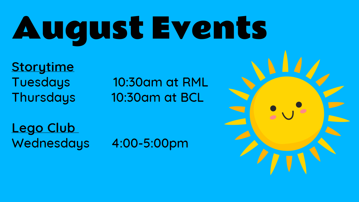 Last Days of Summer Reading! Thank you to everyone who came out to our programs in July! We had a great time and we hope you did too! This month, the Richardson Memorial Library will have family-friendly Monday Movies at 10:30am and Make & Take Craft Days on Tuesdays at 10:30am. If you haven't signed up yet but want to participate in Summer Reading, you can still sign up for the program at Richardson this month! Reading logs and book bingo cards will be due August 31st.