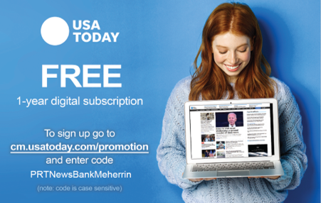 We are excited to announce a special offer for Meherrin Regional Library Patrons from our partners at USA TODAY and NewsBank! The first 100 patrons to sign up will receive a complimentary one-year subscription! An unlimited digital access subscription includes: •Full access to subscriber-only content on your desktop, tablet and mobile device •Exclusive subscriber newsletters •Full access to USA TODAY Sports+ stories and app •The eNewspaper, a digital replica of the print edition |