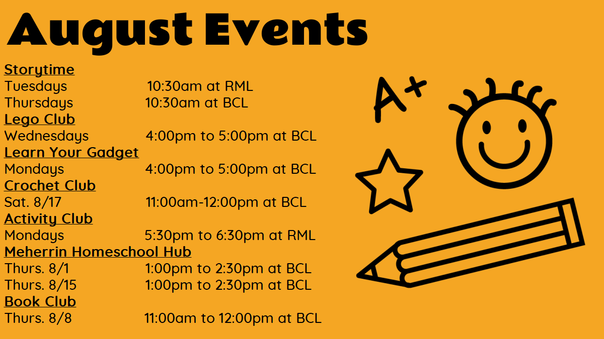 It's Back to School month so what better time to remind parents of the great digital resources we offer for kids of all ages! TumbleBooks and Lightbox Learning both offer interactive ebooks for preschool through middle school. Just for Kids offers kid-safe, parent-approved videos on dozens of subjects. We also offer four research databases, and HelpNow, a homework help website where students can access live tutors. ABC Mouse is also available in-library, no library card required!