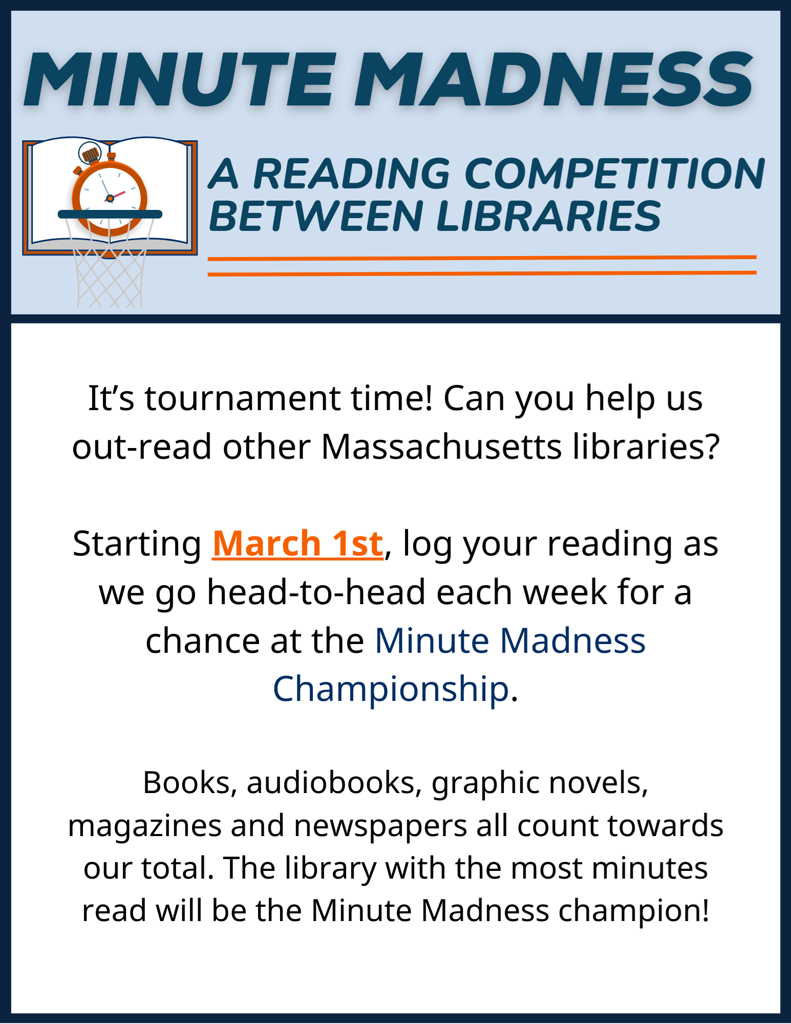 “Is the spring coming?” he said. “What is it like?” … “It is the sun shining on the rain and the rain falling on the sunshine.” – Frances Hodgson Burnett, The Secret Garden March is here and we have a full calendar of programs, several special events, great new additions, and an exciting chance to show everyone how much Holbrook loves to Read during the "Minutes Madness Reading Competition Between Libraries"!
