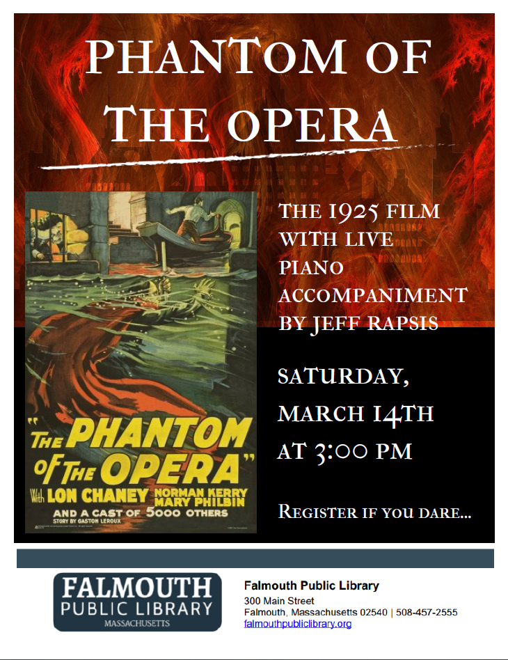 Phantom of the Opera Live with Jeff Rapsis Saturday, March 14th, 3pm-5pmHermann Meeting Room Enjoy a classic 1925 silent film with live music accompaniment with Pianist Jeff Rapsis!