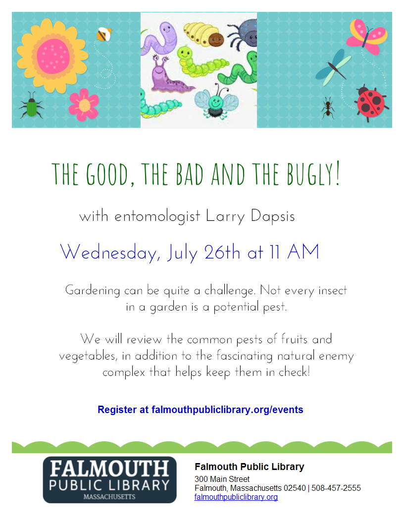 The Good, The Bad, and The Bugly Wednesday July 26, 11am Hermann Room We are glad to welcome entomologist Larry Dapsis back to the Falmouth Public Library on Wednesday morning! Gardening can be quite a challenge. Not every insect in a garden is a potential pest. We will review the common pests of fruits and vegetables, in addition to the fascinating natural enemy complex that helps keep them in check!