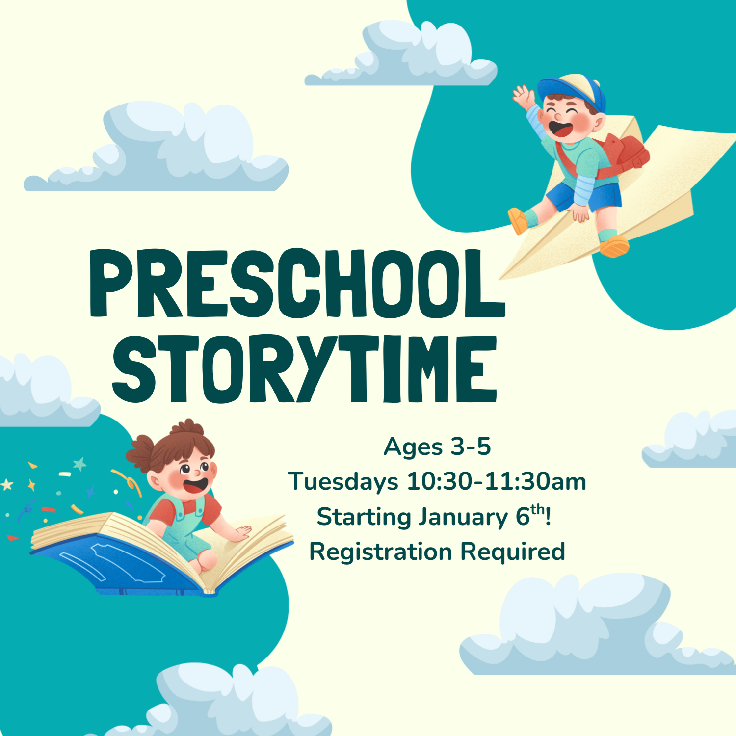 Preschool Storytime Tuesdays 10:30-11:30 AM In the Children's Room Children ages 3-5 and their parents or caregivers are invited to join us in the children’s room for Storytime Tuesday mornings from 10:30-11:30am. Registration required!