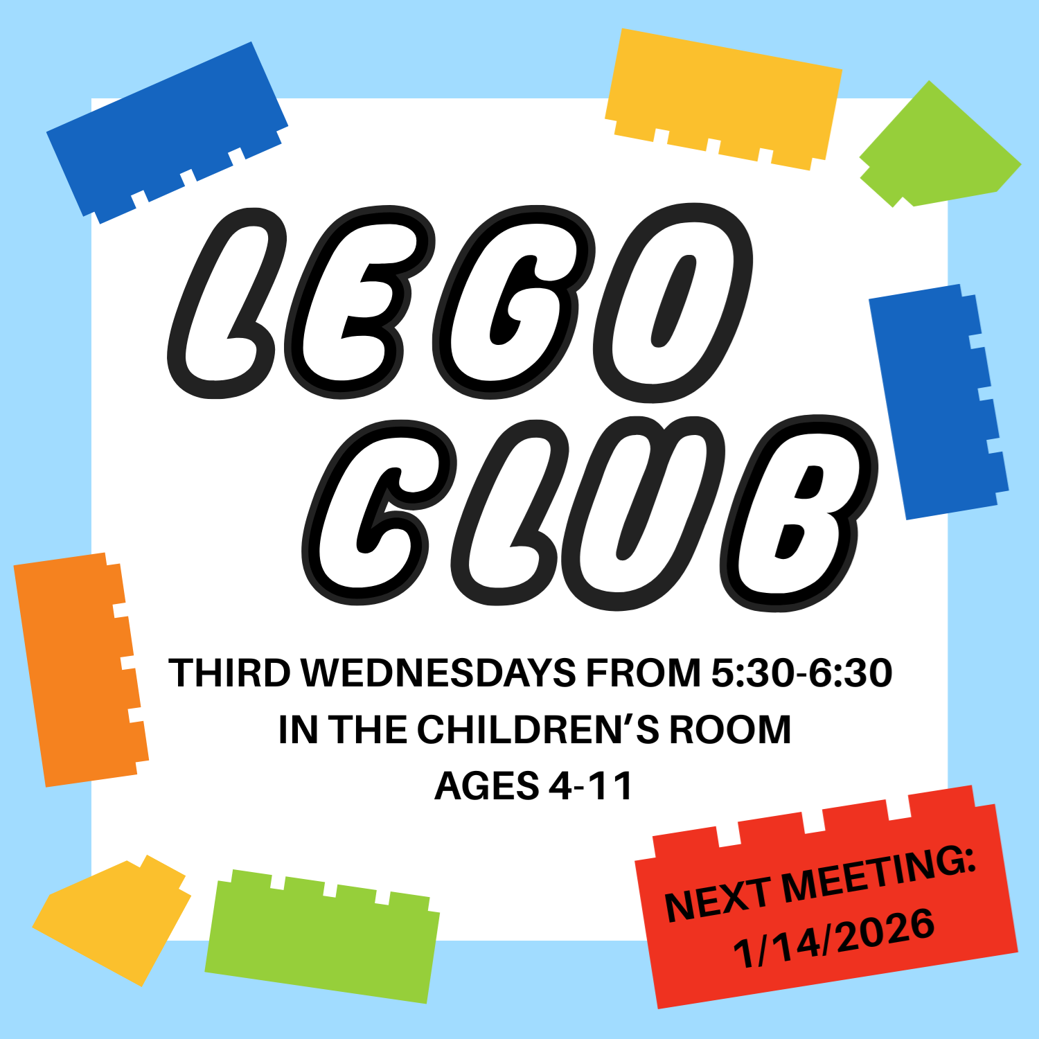 Lego Club: Ages 4-11 Wednesday, January 28, 5:30 PM In the Children's Room Stop by the Children’s Room for Lego Club on the 2nd Thursday of each month! Participate in a new building challenge or make your own creation to display in the children’s room for the month!