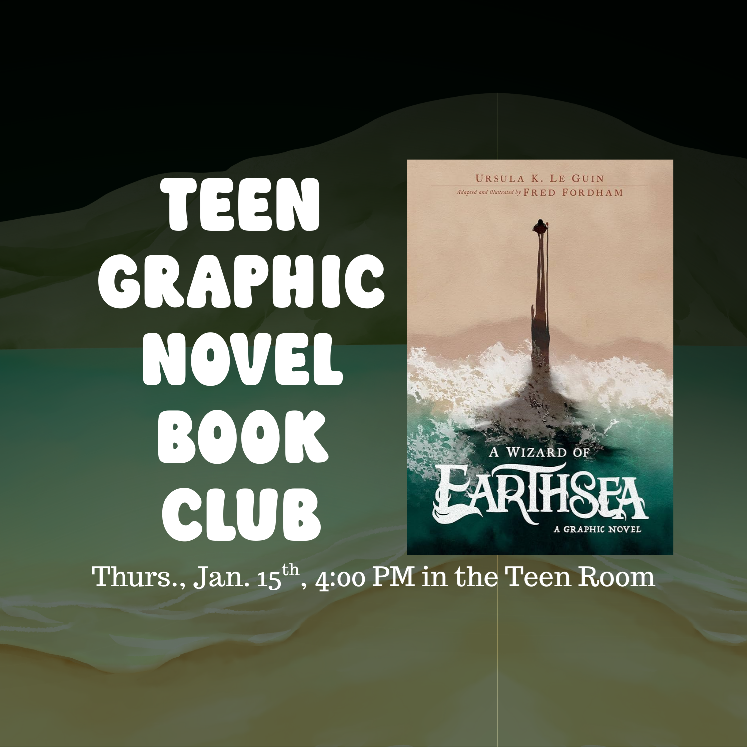 Graphic Novel Book Club: Wizard of Earthsea Thursday, January 15, 4:00 - 5:00pm In the Teen Room Enjoy reading a visual format? Curious about picking up your first graphic novel? Cycle through classics, nonfiction, adaptations, and new graphic novels with our teen librarian Parker, to discuss the art and story of a new graphic novel each month! Drinks and snacks will be provided! No registration is necessary.