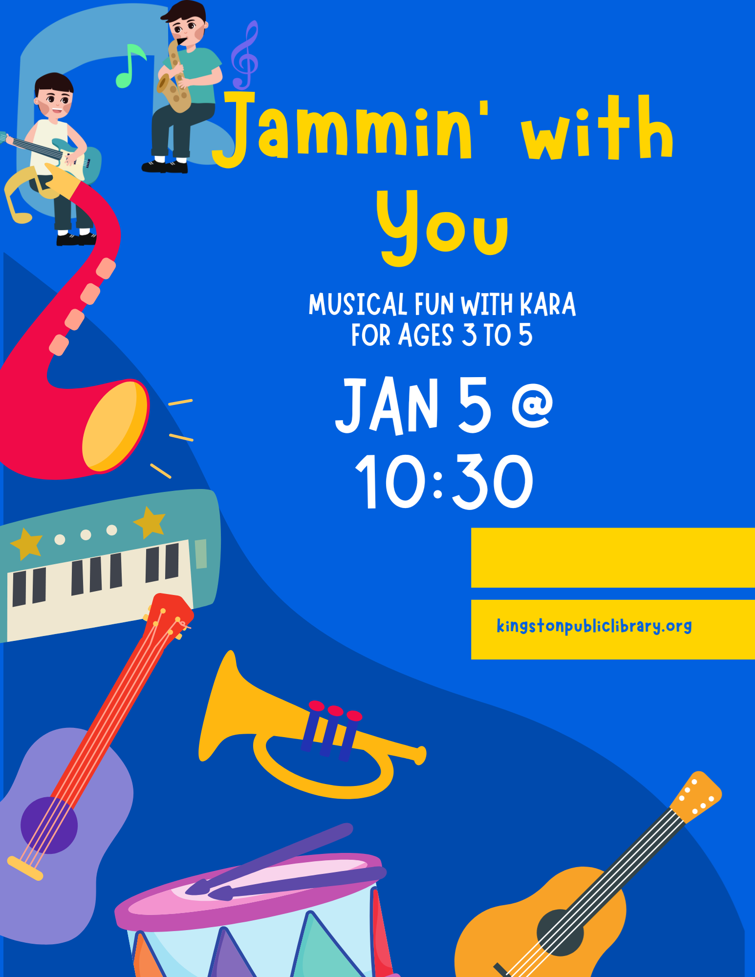 Jammin' With You Monday, January 5 Children's Room 10:30—11:00 AM Ages 3-5 Join Kara from Jammin' with You as she provides music and creative play. All are invited! Caregivers must attend. Registration is encouraged due to space constraint.